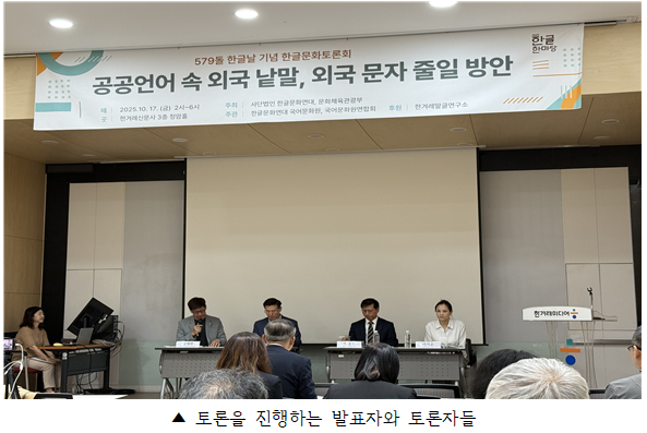 지난 10월 17일, 한글문화연대와 문화체육관광부가 공동으로 주최한 제579돌 한글날 기념 ‘2025 한글문화토론회’가 한겨레신문사 청암홀에서 열렸다. ‘공공언어 속 외국 낱말, 외국 문자 줄일 방안’을 주제로 열린 이번 토론회에서는 세 가지 소주제가 순차적으로 논의되었으며, 그중 두 번째 주제인 ‘국제기구의 한국어 줄임말 사용 방안’을 중심으로, 외국어 약칭 중심의 공공언어 현실과 한글화의 방향을 논의하였다.