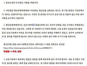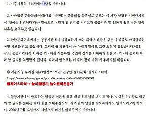2020/07/093 [공문] '플레이스타터라는 외국어 대신 쉬운 우리말을 사용해주십시오.' 외 10건 받는 이 시흥시보건소장(건강도시과장) 제목 플레이스타터라는 외국어 대신 쉬운 우리말을 사용해주십시오. 1. 시흥시청의 우리말글 사랑을 바랍니다. 2. 사단법인 한글문화연대(대표 이건범)는 한글날을 공휴일로 만드는 데 가장 앞장선 시민단체로서 ‘언어는 인권이다’라는 믿음으로 국민의 알 권리를 지키고자 공공기관 및 언론의 쉽고 바른 언어사용을 요구하고 있습니다. 3. 한글문화연대에서는 공공기관에서 불필요하게 쓰는 외국어 낱말을 쉬운 우리말로 바꿔달라는국민 제보를 받고 있습니다. 그런데 귀 기관에서 쓴 아래의 말에도 그런 요청이 있었습니다.(붙임참조) 공공기관에서 어려운 외국어를 사용하면 국민이 정책을 이해하기 힘들고, 외국어 능력에 따라 알 권리를 차별받게 됩니다. 따라서 앞으로는 아래와 같이 바꿔 써 주시.. 2020. 7. 9. [공문] '뱅크라는 외국어 대신 쉬운 우리말을 사용해주십시오.' 외 10건 받는 이 서산시장(사회복지과장) 제목 뱅크라는 외국어 대신 쉬운 우리말을 사용해주십시오. 1. 서산시청의 우리말글 사랑을 바랍니다. 2. 사단법인 한글문화연대(대표 이건범)는 한글날을 공휴일로 만드는 데 가장 앞장선 시민단체로서 ‘언어는 인권이다’라는 믿음으로 국민의 알 권리를 지키고자 공공기관 및 언론의 쉽고 바른 언어사용을 요구하고 있습니다. 3. 한글문화연대에서는 공공기관에서 불필요하게 쓰는 외국어 낱말을 쉬운 우리말로 바꿔달라는국민 제보를 받고 있습니다. 그런데 귀 기관에서 쓴 아래의 말에도 그런 요청이 있었습니다.(붙임참조) 공공기관에서 어려운 외국어를 사용하면 국민이 정책을 이해하기 힘들고, 외국어 능력에 따라 알 권리를 차별받게 됩니다. 따라서 앞으로는 아래와 같이 바꿔 써 주시기를 바랍니다.. 2020. 7. 9. [공문] '컨설팅이라는 외국어 대신 쉬운 우리말을 사용해주십시오.' 외 10건 받는 이 달성군수 (교육청소년과장) 제목 컨설팅이라는 외국어 대신 쉬운 우리말을 사용해주십시오. 1. 달성군청의 우리말글 사랑을 바랍니다. 2. 사단법인 한글문화연대(대표 이건범)는 한글날을 공휴일로 만드는 데 가장 앞장선 시민단체로서 ‘언어는 인권이다’라는 믿음으로 국민의 알 권리를 지키고자 공공기관 및 언론의 쉽고 바른 언어사용을 요구하고 있습니다. 3. 한글문화연대에서는 공공기관에서 불필요하게 쓰는 외국어 낱말을 쉬운 우리말로 바꿔달라는국민 제보를 받고 있습니다. 그런데 귀 기관에서 쓴 아래의 말에도 그런 요청이 있었습니다.(붙임참조) 공공기관에서 어려운 외국어를 사용하면 국민이 정책을 이해하기 힘들고, 외국어 능력에 따라 알 권리를 차별받게 됩니다. 따라서 앞으로는 아래와 같이 바꿔 써 주시기를 .. 2020. 7. 9. 이전 1 다음