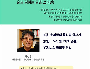 사랑방/사무국, 운영위원 소식142 이건범 대표 글쓰기 강좌 복지국가 앞당기는 글쓰기 술술 읽히는 글을 쓰려면! 가끔은 나도 이해하기 어려워 할 글을 쓰고 있지는 않습니까? 나의 주장을 남들이 쉽게 알아먹을 수 있도록 글을 쓴다면, 내 생각과 운동은 더 넓게 공감을 얻지 않을까요? 나의 글버릇을 분석하고 바꿀 절호의 기회! ● 일시 : 4월 9일, 16일, 23일(월요일 저녁 7~9시) ● 수강료: 5만원(회원·미취업생은 3만원) *입금 계좌 : 국민은행 815601-04-112337(내가만드는복지국가) ● 장소: 내만복 교육장(홍대입구역 4번 출구, 정치발전소 내부) 2018. 4. 5. 우리말글 강연 활동 / 한국교통대 증평캠퍼스 [우리말글 강연 활동] ● 이건범 대표 ▷ 때/곳: 2018년 3월 29일, 한국교통대 증평캠퍼스 ▷ 대상: 한국교통대학생 '언어는 인권이다' 2018. 3. 30. [한글새소식-546] 안전 위협하는 외래어 남용/정재환 한글문화연대 공동대표 * 2018년 2월 한글학회 [한글새소식 546]에 실린 정재환 공동대표의 글을 소개합니다. * 한글학회 가기--->> 2018. 2. 27. [알림] 제8대 한글문화연대 대표 선출 선거 결과 이건범 후보자의 단독 출마에 따라 대표 선출 찬반 투표를 진행한 결과를 알립니다. 투표권이 있는 정회원 412명 중 투표에 참여한 정회원은 273명입니다. 투표 결과는 270명이 찬성하고 3명이 반대하여, 투표율 66%, 찬성율 99%로 이건범 대표의 선출을 확정했습니다. 2018. 2. 14. 이건범 대표, 사교육걱정없는 세상 기자회견 참석 한글문화연대를 비롯한 33개 시민단체가 지난 1월 10일(수), 정부서울청사 앞에서 유치원·어린이집 방과 후 영어수업뿐 아니라 유아 대상 영어학원들의 선행교육도 금지하라는 기자회견을 열었습니다. ** 기자회견 ▷ 영상 보러 가기 ▷ 기자 회견 전문 보러가기 2018. 1. 11. 2018년, 새해 복 많이 받으세요. 2018. 1. 4. [이웃집 소식] 공연 소식 <작은 할머니-그 여자의 소설> 이 행사는 우리 단체 남궁 현 감사님이 기획/제작한 공연입니다. 출처: http://www.urimal.org/1035 [한글문화연대 새 누리집] 2017. 11. 30. [활동]정재환 공동대표 특강 ● 정재환 공동대표 특강 ▷ 강연 주제 : '큐우슈우역사기행'으로 짚어보는 한일관계사 ▷ 대상 : 한민고등학교 ▷ 때 : 2017년 11월 15일 2017. 11. 16. [활동]서울시엔피오지원센터장 면담 서울시엔피오지원센터에 다녀왔습니다. 우리 단체에서 11월 6일에 센터에 공문을 보내 "센터에서 어려운 외국어를 너무 많이 쓴다. 알기 쉽게 우리말을 써 시민의 알 권리를 보장해 달라"는 내용으로 센터장 면담을 요청한 바 있습니다. 한 시간 남짓 이야기를 나눴는데요. 우리 단체가 지적하는 외국어 남용에 대해서 정선애 센터장은 "동감한다"고 표현하며 ,"언어 문화를 바꿔보자"며 적극적인 대안까지 제시했습니다. 내용을 정리하면 다음과 같습니다. 1. 서울시엔피오지원센터 직원을 상대로 한 '왜 알기 쉬운 우리말이 중요한가'라는 강연을 해 달라. 2. 습관처럼 쓰는 외국어를(퍼실리테이터 등) 쉬운 우리말로 바꿔 부르는 홍보물을 꾸준하게 만들어 퍼트리자. 3. 여러 비영리민간단체에서 사업 이름을 지을 때 도움말을 .. 2017. 11. 16. 이전 1 ··· 9 10 11 12 13 14 15 16 다음