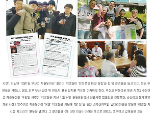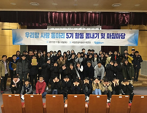 사랑방/우리말가꿈이푸른(전 우리말사랑동아리)75 우리말 사랑 동아리 6기 모집 한글문화연대 '우리말 사랑 동아리 6기'를 모집합니다.- 쉬운 말로 국민과 소통하는 공공언어문화- 품격있고 올바른 말이 이끄는 언어문화 - 어른의 관심과 청소년의 참여로 맑아지는 언어문화를 퍼뜨려 주세요. 신청 기간 2018년 7월 15일(일)까지 * 마감일이 학교 시험과 겹쳐 신청서 작성에 어려움이 많다는 문의가 많습니다. 신청 마감일을 7월 15일로 연기했습니다. 7월 21일(토), 서울에서 열리는 오름마당 일정을 꼭 확인해 주시기 바랍니다. 신청 자격 우리말과 한글을 주제로 ‘언어문화 개선’ 활동을 하고자 하는 중·고등학생 동아리※ 새롭게 활동하고자 하는 사람도 동아리를 만들어 지원할 수 있습니다. ※ 동아리 최소 인원은 3명입니다. ※ 신청할 수 없는 동아리 - 개인(강사), 지역, 단체, 시설의.. 2018. 7. 4. [알림] 우리말 사랑 동아리 6기를 모집합니다(5/30~7/15) 한글문화연대 '우리말 사랑 동아리 6기'를 모집합니다. - 쉬운 말로 국민과 소통하는 공공언어문화 - 품격있고 올바른 말이 이끄는 언어문화 - 어른의 관심과 청소년의 참여로 맑아지는 언어문화를 퍼뜨려 주세요. 신청 기간 2018년 5월 30일(수)~7월 15일(일) * 마감일이 학교 시험과 겹쳐 신청서 작성에 어려움이 많다는 문의가 많습니다. 신청 마감일을 7월 15일로 연기했습니다. 7월 21일(토), 서울에서 열리는 오름마당 일정을 꼭 확인해 주시기 바랍니다. 신청 자격 우리말과 한글을 주제로 ‘언어문화 개선’ 활동을 하고자 하는 중·고등학생 동아리 ※ 새롭게 활동하고자 하는 사람도 동아리를 만들어 지원할 수 있습니다. ※ 동아리 최소 인원은 3명입니다. ※ 신청할 수 없는 동아리 - 개인(강사), .. 2018. 5. 30. [5기]동양온새미로(동양중) 우리말사랑동아리활동/교내 시상 우리말사랑동아리 5기로 활동한 인천동양중학교 는 2017년 국립국어원 원장상 으뜸상을 받은 동아리입니다. 으뜸상을 받은 동아리를 축하하기 위해 학교 교장선생님께서 대표와 부원들을 불러서 따로 시상을 해 주었습니다. 우리말사랑동아리 5기로 활동을 시작할 때부터 학교에서는 발대식도 따로 마련해 주고, 활동이 마칠 때도 동아리원들을 응원해 주었습니다. 고맙습니다. 2018. 1. 12. <함께하는 교육>에 소개된 우리말 사랑 동아리 - 한겨레신문/2017.12.19 한글문화연대가 이끌고 있는 우리말 사랑 동아리는 우리말과 한글을 주제로 '언어문화 개선' 활동을 하고자 하는 중·고등학생 동아리를 말합니다. 매년 7월부터 11월까지 활동을 펼치고 있고, 올해로 5기까지 활동을 마쳤습니다. 한겨레신문 은 매주 교육과 관련한 내용의 기사를 소개하고 있습니다. 이번주 에서는 서울 외 경기, 지방 고등학교에서 열심히 활동하고 있는 고교 동아리를 다뤘습니다. 여기에 우리말 사랑 동아리가 소개가 되었습니다. 청소년판 "팀플", 모집부터 홍보까지 직접 해봐 2017. 12.19 * 기사 보러가기 * 기사 내용 보기 * 청소년판 "팀플", 모집부터 홍보까지 직접 해봐 2017. 12.19 자율동아리 어떻게 꾸려볼까? 수시 학종 대세 속 비교과 중요해져 학생이 주도해 꾸리는 자율동아리.. 2017. 12. 20. [마침] 우리말 사랑 동아리 5기 활동뽐내기 및 마침마당(사진) 2017년 11월 18일(토), 용산국립한글박물관에서 우리말 사랑 동아리 5기 활동 뽐내기 및 마침마당이 있었습니다. 한글문화연대는 지난 7월 초 우리말을 가꾸고 우리말 활동을 열심히 해나갈 중고생 동아리 18곳을 뽑았습니다. 뽑힌 18곳의 중고생 동아리들은 7월부터 11월까지 학교안팎으로 우리말 사랑을 펼쳐나갔습니다. 아침 등교 시간이나 점심 시간을 활용하여 학교 친구들이나 선생님에게 우리말 사랑을 홍보 하였고, 주말이나 한글날에는 동아리부원과 함께 학교 밖에서 시민을 대상으로 우리말 사랑 홍보 활동을 열심히 하였습니다. 이날 동아리별로 활동 뽐내기 발표가 있었습니다. 우리말 사랑 동아리들은 활동을 해나가면서 주변 친구들이 사용하는 말, 무심코 내뱉는 말이나 욕, 텔레비전에서, 온라인에서, 주변에서 사.. 2017. 11. 21. [5기]꿈꾸는 색동애벌레(모임) 우리말사랑동아리 활동/영상 우리말사랑동아리 5기로 활동하고 있는 꿈꾸는 색동애벌레 동아리 활동을 소개합니다. 2017. 11. 1. [5기]바로세움(염광고) 우리말사랑동아리 활동/영상 우리말사랑동아리 5기로 활동하고 있는 바로세움 동아리 활동을 소개합니다. 2017. 11. 1. [5기] 우리말 사랑이(숭신여고) 우리말사랑동아리 활동/야외 활동 우리말사랑동아리 5기로 활동하고 있는 우리말 사랑이의 우리말 활동을 소개합니다. 1. 야외활동 1) 때: 2017년10월 14일 누리소통망(페이스북)에 홍보 실시한 후 율동공원 2) 활동 내용: 1. 비속어 사용빈도 조사를 통해 비속어 사용을 줄이기. 2. 외래어로 쓰인 상품을 우리말로 고치기. 3. 우리말 퀴즈를 통해 우리말을 더 쉽고 친근하게 접근하도록 하기 등. 2017. 11. 1. [5기] 아름말꽃누리(성심여고) 우리말사랑동아리 활동/소식지 우리말사랑동아리 5기로 활동하고 있는 아름말꽃누리 동아리 활동을 소개합니다. 2017. 11. 1. 이전 1 ··· 3 4 5 6 7 8 9 다음
