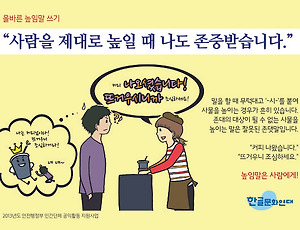 활동/올바른 높임말 쓰기11 [영상]올바른 높임말-찻집에서 #1커피집에서-올바른 높임말 동영상-한글문화연대 * 사람을 제대로 높일 때 나도 존중받습니다. 주문하신 커피 나오셨습니다. 뜨거우시니까 조심하시구요. 물은 반대편에 있으십니다. 결제는 어떻게 도와드릴까요? 포인트 적립 가능하십니다. http://youtu.be/XYa-ilSwEO4 2013. 10. 22. 사물 주체로 '-시'를 붙이는 높임말은 잘못이다. 판매 직원들의 비문법적인 과대 존경 표현에 대해 많은 시민들이 어색한 반응을 보이고 있는데도 잘 고쳐지지 않는다. 존대의 대상이 될 수 없는 사물에 ‘-시-’를 붙여 존대법을 적용하는 것은 잘못이다. 가령, “반응이 너무 좋으세요.”라든지 “주문하신 상품이 나오셨습니다.”처럼 경어법의 ‘-시-’를 남용하는 것은 바람직하지 않다. 그러다 보니, 백화점이나 홈쇼핑 채널에서 “이 구두는 볼이 넓으셔서 발이 편하세요.”, “색깔이 예쁘십니다.”, “모든 상품이 품절이세요.”와 같이 사물 주체에 ‘-시-’를 사용하는 잘못이 널리 퍼지고 있다. 어떤 할인점에 가보면 상품 안내 도우미들이 진열대 곳곳에서 손님들에게 여러 상품을 소개하는 모습을 볼 수 있다. 이들에게서, “이 제품이 이벤트 기간이기 때문에 훨씬 저렴하.. 2013. 9. 6. 이전 1 2 다음