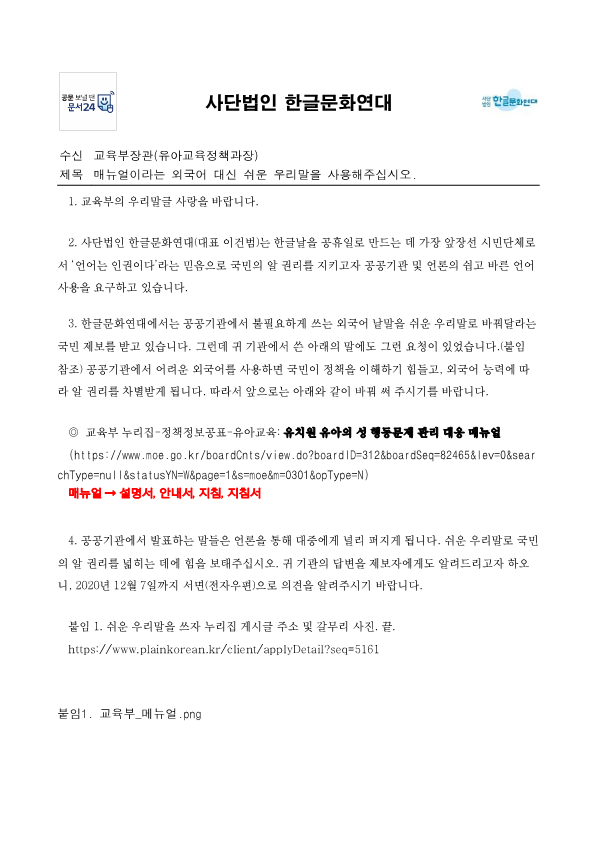| 매뉴얼이라는 외국어 대신 쉬운 우리말을 사용해주십시오. | 교육부 유아교육과 | 2020년 11월 29일 |