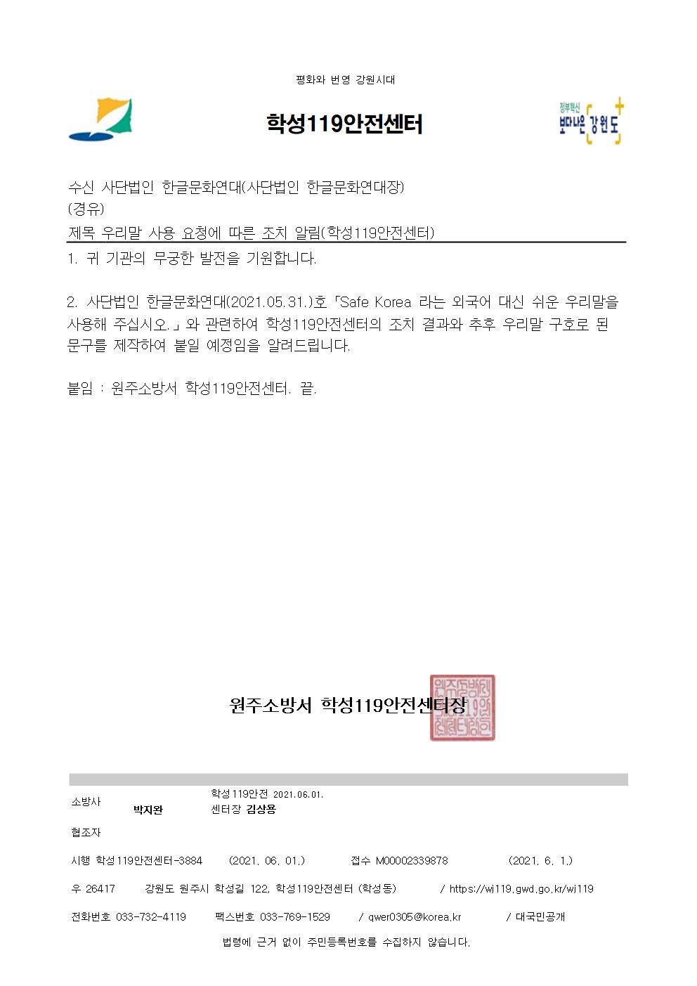 2. 사단법인 한글문화연대(2021.05.31.)호「Safe Korea 라는 외국어 대신 쉬운 우리말을 사용해 주십시오.」와 관련하여 학성119안전센터의 조치 결과와 추후 우리말 구호로 된 문구를 제작하여 붙일 예정임을 알려드립니다.