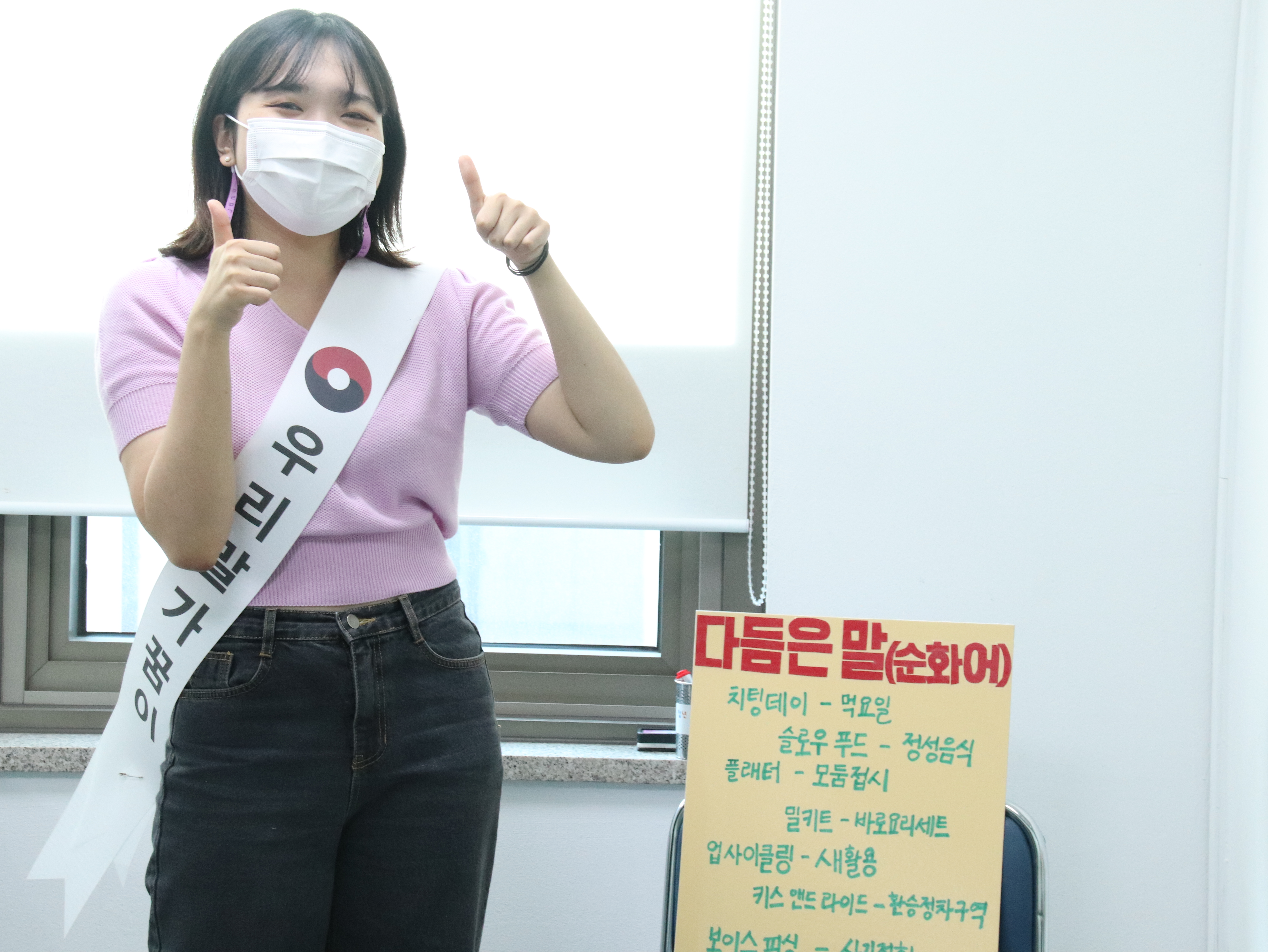 행사 직전인 오전까지도 비가 와 원래 계획했던 <시민참여> 행사는 무산되었습니다. 하지만 거짓말처럼 화창한 날씨가 계속되자 달보드레 모둠원 중 몇 명이 밖으로 나가 시민들에게 순화어에 대해서 얼마나 아는지 물어보고, 우리말과 우리말가꿈이를 홍보하는 일을 했답니다.