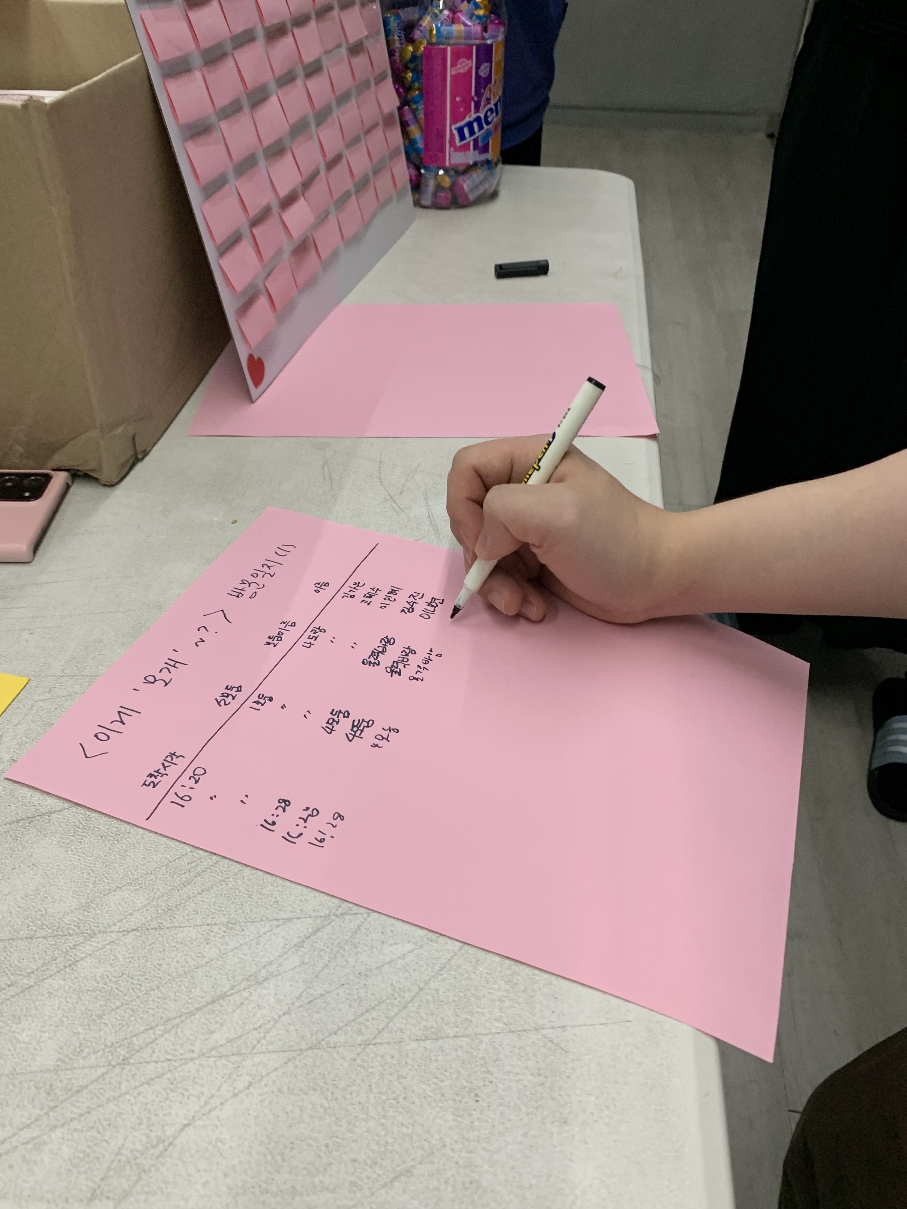 다트를 던져 풍선을 터트리면 외국어 쪽지가 나오는데 그걸 1분 안에 순화하는 임무가 주어졌습니다. 임무에 성공하면 열심히 쓰담달리기를 하러 출발하는 가꿈이들에게 당 떨어지지 말라고 열심히 포장한 간식도 주었답니다.