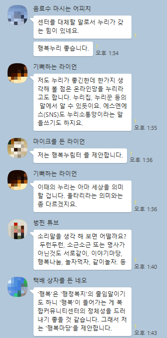 이 중 '행복누림터'를 제안한 김형주 님은 '행정복지'를 줄여 부르는 '행복'과 '행복하다'의 '행복' 뜻을 겹쳐서 단어화해 만들었고 2019년 세종시장이 "세종시, 복합커뮤니티센터 운영 개선"이라는 제목의 기사를 보여주시면서 세종시장에게 강력하게 이름을 바꿀 것을 요구해야 한다고 하셨다.