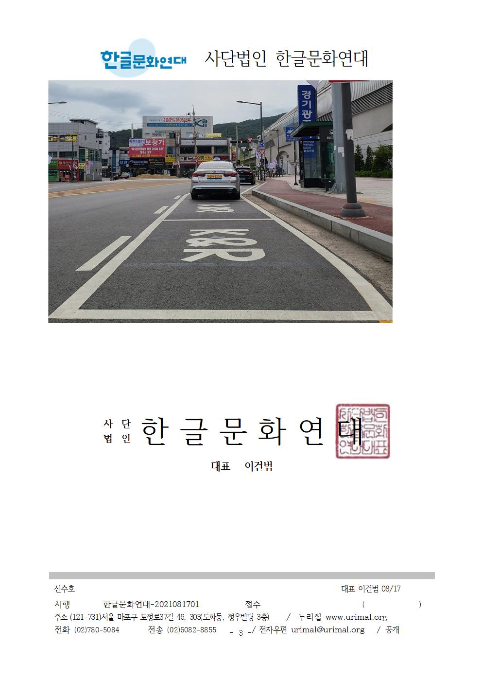 3. 경기광주역 2번 출구에 있는 ‘K&R’이라는 노면 표시를 우리말로 바꿔 써 주십시오. 2020년 7월, 한글문화연대에서 이끄는 대학생 동아리 ‘우리말가꿈이’에서 건의하여 경기광주역의 ‘K&R’이라는 외국어 노면 표기를 ‘환승정차구역’이라는 우리말 노면 표기로 개선했습니다. 그런데 2021년 8월, 경기광주역에 방문하여 확인해보니 다시 ‘K&R’이라는 외국어 노면 표기가 쓰여 있었습니다.
