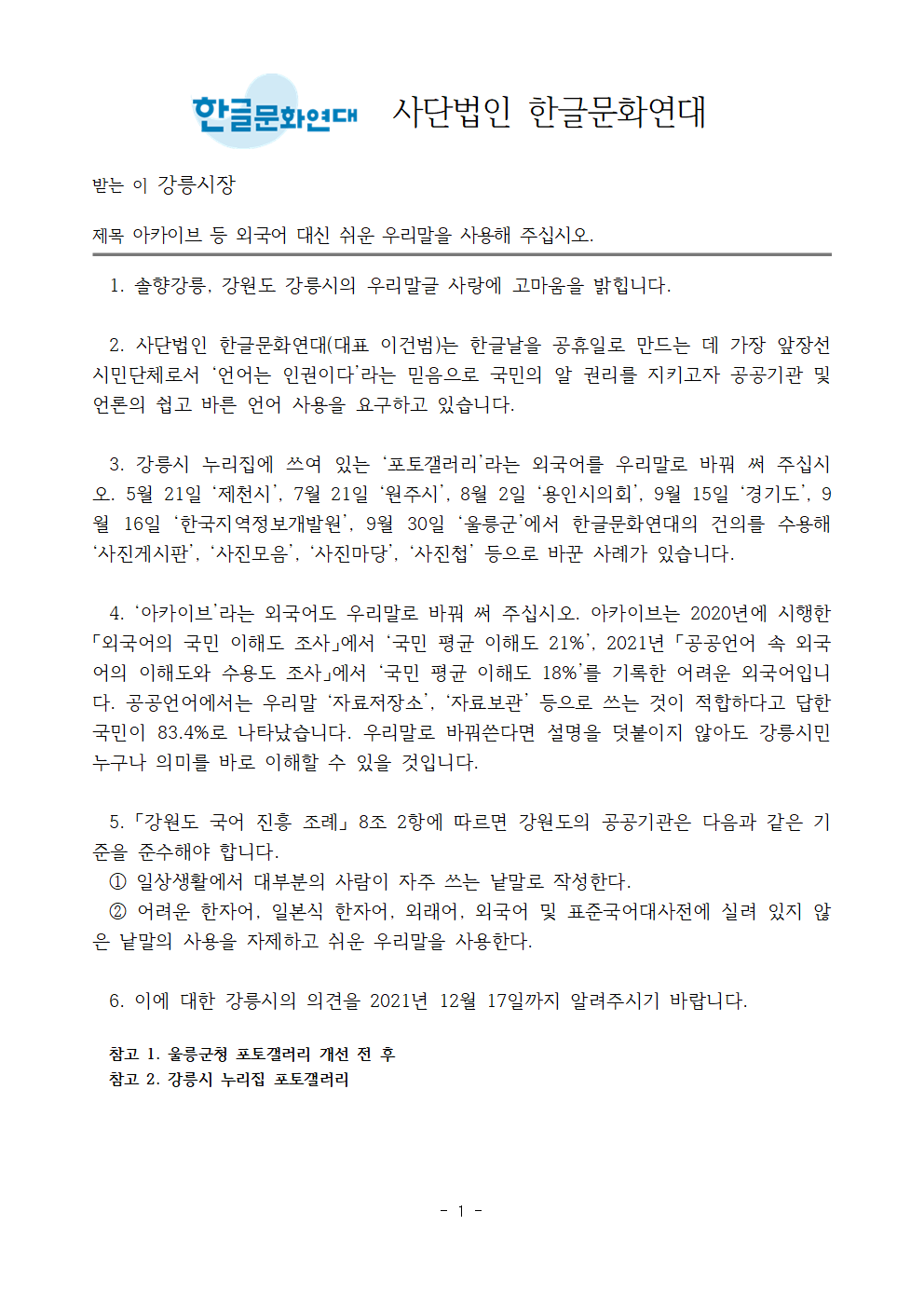 [공문] 아카이브 등 외국어 대신 쉬운 우리말을 사용해 주십시오. - 2021.11.30 강릉시