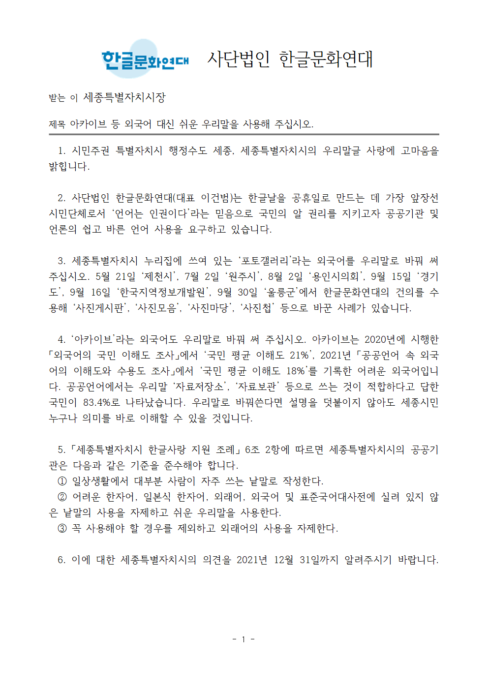 [공문] 아카이브 등 외국어 대신 쉬운 우리말을 사용해 주십시오. - 2021.12.17 세종특별자치시