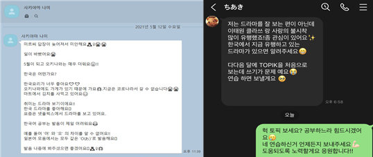 기자는 일본인 수강생 사키야마 나미 씨와 마스노 치아키 씨를 대상으로 올해 4월부터 6월까지 한국어 도우미 활동을 했다. 코로나로 인해 두 분 모두 일본에 있어, 누리소통망을 이용해 소통했다. 나미 씨는 한국의 음악과 드라마, 문학에 관심이 많아 한국어를 공부하기 시작했다. 고등학생 때 가수 동방신기를 좋아했으며 지금은 가수 ‘방탄소년단(BTS)’의 팬이다. 케이팝 사랑은 한국어 사랑으로 번져나갔다. 치아키 씨는 2017년도에 서울 여행을 했는데 한국의 음식과 거리의 분위기 등 한국 문화에 반하여 한국어 공부를 시작했다고 한다. 두 사람 모두 평일 낮에는 직장을 다녀서 퇴근 후 저녁이나 주말에 한국어 공부를 한다고 한다. 직장 생활과 병행하며 한국어를 열심히 공부하는 두 사람의 모습은 학생들에게 모범과 자극이 될 만하다.