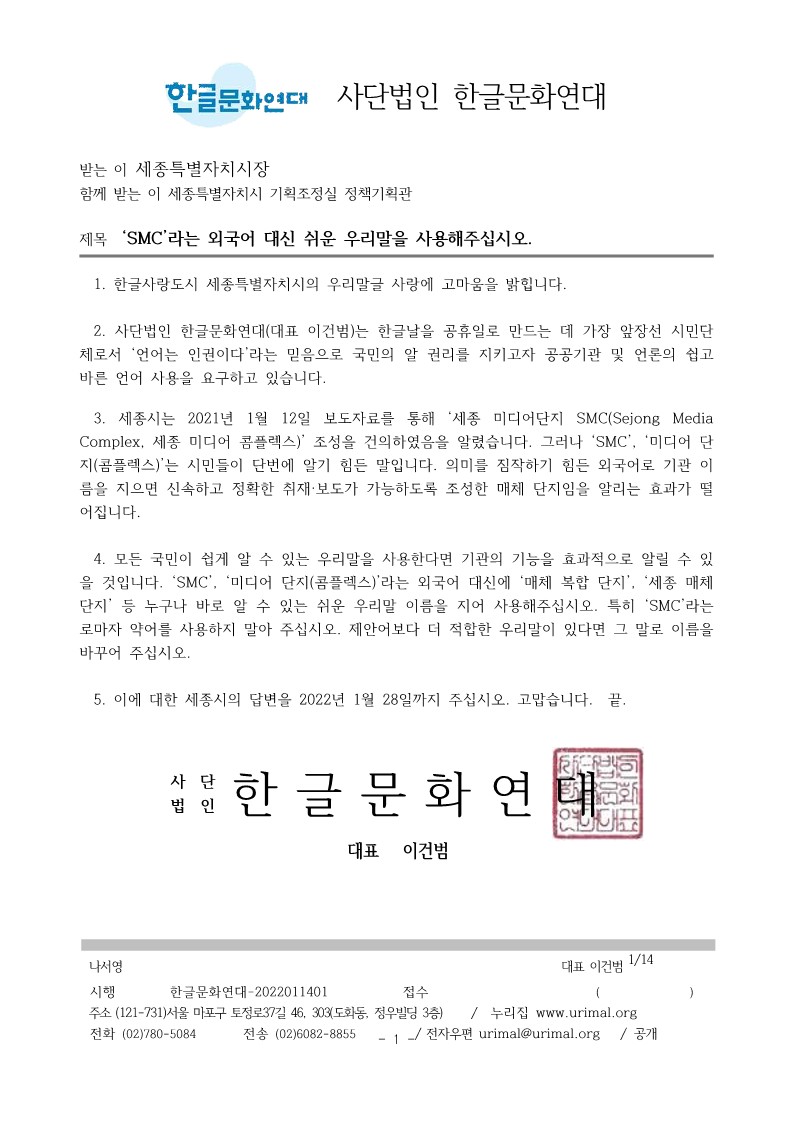 [공문] ‘SMC’라는 외국어 대신 쉬운 우리말을 사용해주십시오. - 2022.01.14 세종특별자치시