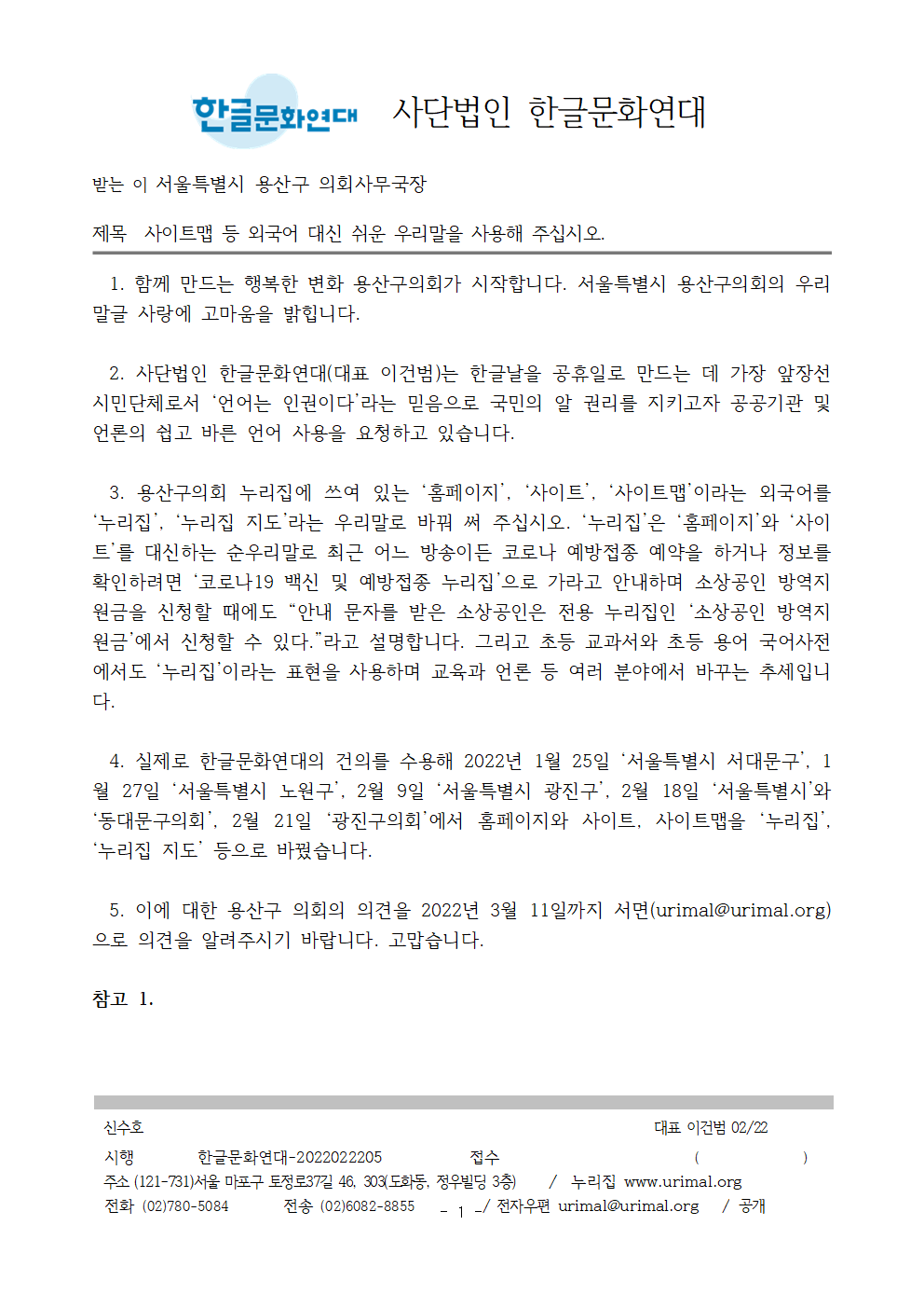 [공문] 사이트맵 등 외국어 대신 쉬운 우리말을 사용해 주십시오. 서울특별시 용산구의회 2022.02.22