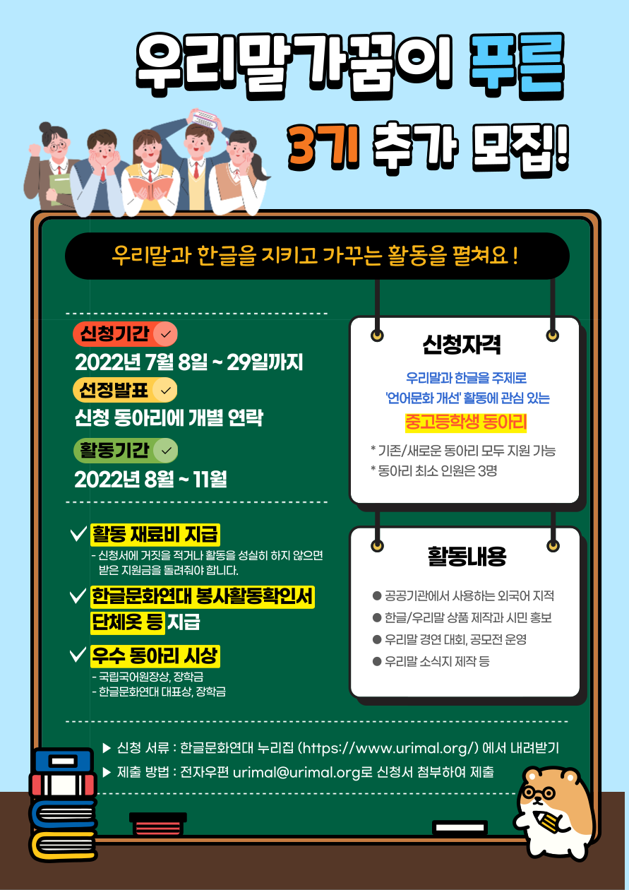 한글문화연대 '우리말가꿈이 푸른 3기'(전 우리말사랑동아리)를 추가 모집합니다.