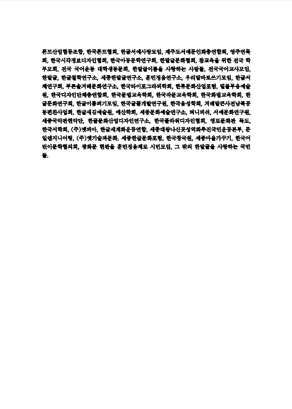 한글학회, 세종대왕기념사업회, 외솔회, 한글문화연대, 한국겨레문화연구원, 국어순화추진회, 한글재단, 한글사랑운동본부, 한국국어정보학회, 국어단체연합 세종국어문화원, 국어문화운동본부, 세종한글서예큰뜻모임, 갈물한글서회, 짚신문학회, 훈민정음학회, 한국캘리그라피디자인협회, 우리말 살리는 겨레모임, 국어문화운동실천협의회, 훈민정음가치연구소, 헐버트박사기념사업회, 한글바른말연구원, 한글문화세계화추진본부, 한국땅이름학회, 한국폰트산업협동조합, 한국폰트협회, 한글서예사랑모임, 제주도서예문인화총연합회, 영주연묵회, 한국시각정보디자인협회, 한국아동문학연구회, 한말글문화협회, 참교육을 위한 전국 학부모회, 전국 국어운동 대학생동문회, 한말글이름을 사랑하는 사람들, 전국국어교사모임, 한말글, 한글철학연구소, 세종한말글연구소, 훈민정음연구소, 우리말바로쓰기모임, 한글서체연구회, 푸른솔겨레문화연구소, 한국타이포그라피학회, 한류문화산업포럼, 밀물무용예술원, 한국디자인단체총연합회, 한국문법교육학회, 한국작문교육학회, 한국화법교육학회, 한글문화연구회, 한글이름펴기모임, 한국글꼴개발연구원, 한국음성학회, 겨레말큰사전남북공동편찬사업회, 한글새김예술원, 애산학회, 세종문화예술연구소, 퍼니피쉬, 서예문화연구원, 세종국악관현악단, 한글문화산업디자인연구소, 한국플라워디자인협회, 영토문화관 독도, 한국서학회, (주)넷피아, 한글세계화운동연합, 세종대왕나신곳성역화추진국민운동본부, 문일엔지니어링, (주)옛기술과문화, 세종한글문화포럼, 한국창극원, 세종마을가꾸기, 한국어린이문학협의회, 광화문 현판을 훈민정음체로 시민모임, 그 밖의 한말글을 사랑하는 국민들.