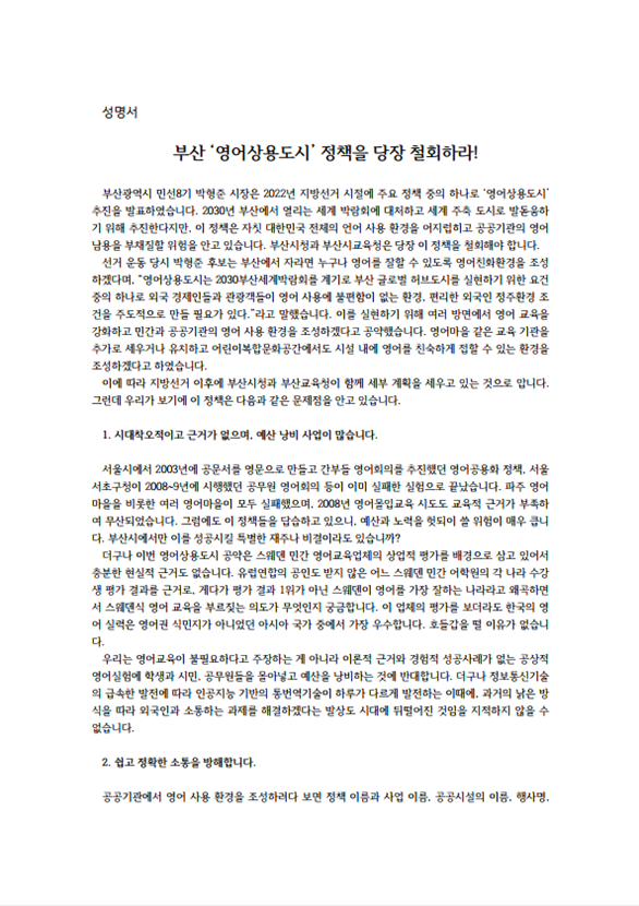 부산광역시 민선8기 박형준 시장은 2022년 지방선거 시절에 주요 정책 중의 하나로 ‘영어상용도시’ 추진을 발표하였습니다. 2030년 부산에서 열리는 세계 박람회에 대처하고 세계 주축 도시로 발돋움하기 위해 추진한다지만, 이 정책은 자칫 대한민국 전체의 언어 사용 환경을 어지럽히고 공공기관의 영어 남용을 부채질할 위험을 안고 있습니다. 부산시청과 부산시교육청은 당장 이 정책을 철회해야 합니다.