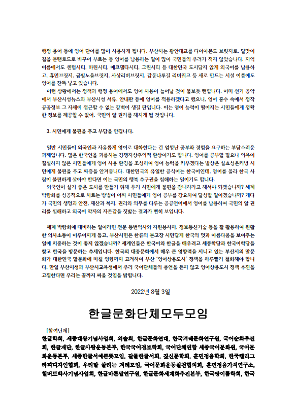 세계 박람회에 대비하는 일이라면 전문 통번역사와 자원봉사자, 정보통신기술 등을 잘 활용하여 원활한 의사소통이 이루어지게 돕고, 부산시민은 한류의 본고장 시민답게 한국의 멋과 아름다움을 보여주는 일에 치중하는 것이 좋지 않겠습니까? 세계인들은 한국어와 한글을 배우려고 세종학당과 한국어학당을 찾고 한국을 방문하는 추세입니다. 한국의 대중문화에서 매우 큰 영향력을 지니고 있는 부산시의 말문화가 대한민국 말문화에 미칠 영향까지 고려하여 부산 ‘영어상용도시’ 정책을 하루빨리 철회해야 합니다. 만일 부산시청과 부산시교육청에서 우리 국어단체들의 충언을 듣지 않고 영어상용도시 정책 추진을 고집한다면 우리는 끝까지 싸울 것임을 밝힙니다.