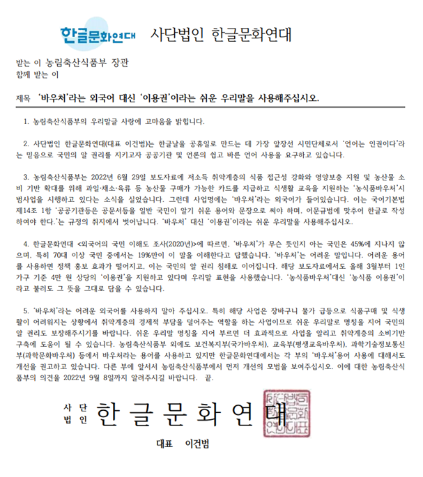 5. ‘바우처’라는 어려운 외국어를 사용하지 말아 주십시오. 특히 해당 사업은 장바구니 물가 급등으로 식품구매 및 식생활이 어려워지는 상황에서 취약계층의 경제적 부담을 덜어주는 역할을 하는 사업이므로 쉬운 우리말로 명칭을 지어 국민의 알 권리도 보장해주시기를 바랍니다. 쉬운 우리말 명칭을 지어 부르면 더 효과적으로 사업을 알리고 취약계층의 소비기반 구축에 도움이 될 수 있습니다. 농림축산식품부 외에도 보건복지부(국가바우처), 교육부(평생교육바우처), 과학기술정보통신부(과학문화바우처) 등에서 바우처라는 용어를 사용하고 있지만 한글문화연대에서는 각 부의 ‘바우처’용어 사용에 대해서도 개선을 권고하고 있습니다. 다른 부에 앞서서 농림축산식품부에서 먼저 개선의 모범을 보여주십시오. 이에 대한 농림축산식품부의 의견을 2022년 9월 8일까지 알려주시길 바랍니다. 끝.