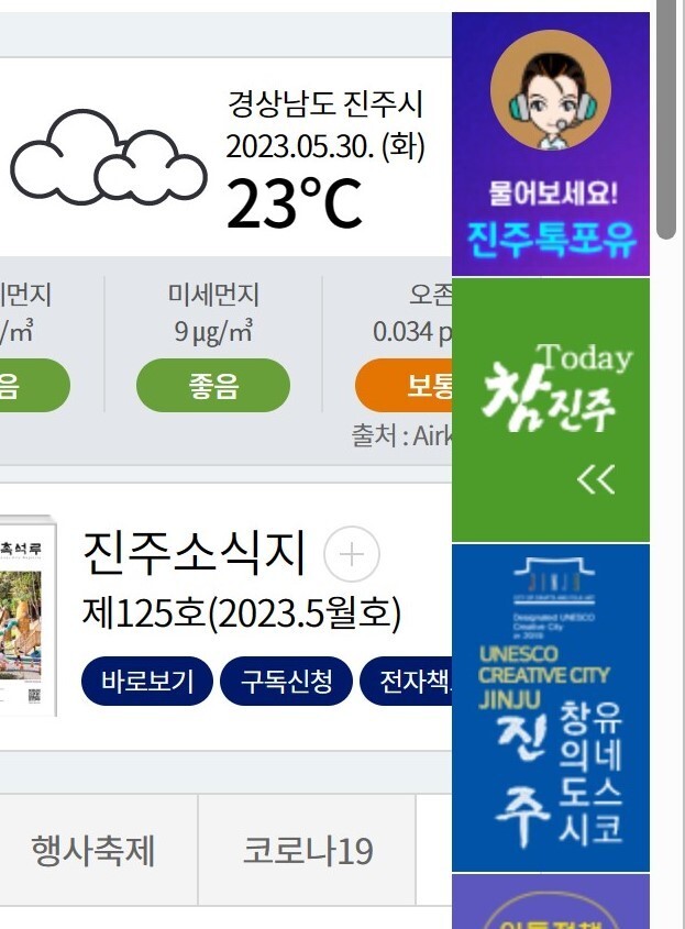 진주시 누리집에 들어가면 첫 화면에서 ‘진주 톡포유’, ‘today 참진주’라고 쓰인 단추를 볼 수 있다. 여기서 ‘진주 톡포유’ 단추를 누르면 자동 문의 화면으로 넘어간다. ‘톡포유(talk for you)’가 자동 문의 대신 쓰인 말이라는 걸 모르는 사람은 자동 문의 화면으로 넘어가고 싶을 때 곤혹을 느낄 것이다. 또, ‘today 참진주’ 단추를 누르면 진주시의 ‘오늘의 행사’와 ‘오늘의 소식’을 소개하는 창이 나타난다. ‘today 참진주’의 'today'는 영어 알파벳으로 표기되었다. 영어를 읽을 줄 모르는 사람은 ‘today’가 무슨 의미인지 알 수 없다. 그런 사람은 진주시 누리집에서 진주시의 ‘오늘의 행사’와 ‘오늘의 소식’을 알아내기 어려울 것이다.