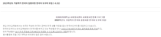 이화여자대학교에서는 매년 한국어 관련한 봉사활동인 ‘한국어 도우미’를 지원할 사람을 모집하고 있다. 이화여자대학교 대학생, 대학원생을 대상으로 한다. 활동 내용은 주 1회 이상 외국인 친구의 한국어 학습을 돕는 것이다. 매번 대면으로 활동을 진행하며, 활동 후 매주 금요일까지 활동 내용을 언어교육원 홈페이지에서 봉사일지로 작성하면 된다.