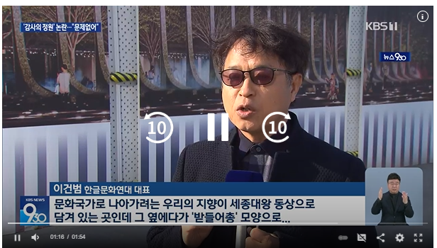 한국방송공사(KBS)에 한글문화연대 대표 이건범님이 서울시 '감사의 정원' 관련 뉴스에 출연해 의견을 밝혔습니다.