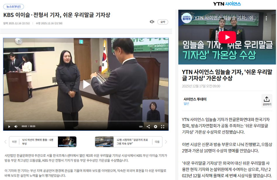 지난 1년간 평소 기사를 작성할 때 쉬운 우리말을 사용하려고 노력한다는 중부일보 강현수 기자님은 지난 대선에서 후보들의 공약집을 살펴 외국어 사용 현황을 지적하는 기사를 써 쉬운 우리말글 사용의 필요성을 일깨웠습니다. 또, 보도자료의 용어를 그대로 옮겨 쓰지 않고, ‘타임라인’은 ‘시간 순서’, ‘킬러 문항’은 ‘초고난도 문항’으로 바꿔서 기사를 쓰는 등 어려운 외국어가 보이면 여기저기 찾고 고민하는 점 등을 높이 평가받아 신문 부문의 으뜸상을 드렸습니다. 방송 부문 으뜸상 수상자인 한국방송 이이슬 기자님은 평소 부산 지역의 공공언어 환경에 관심을 기울여 취재와 보도를 이어온 데다 익숙한 외국어 표현이라도 더 쉬운 우리말로 바꾸어 보도한 실천적 노력을 높이 평가받았습니다. ‘AI’를 ‘인공지능’으로, ‘R&D’를 ‘연구개발’로 ‘플랫폼’이나 ‘워크숍’도 ‘토론의 장’이나 ‘논의 모임’ 등 맥락에 맞추어 우리말로 보도하고, 외국어로만 이름 붙여진 행사명도 독자와 시청자가 쉽게 이해할 수 있게 우리말로 풀어서 보도하였기에 방송 부문의 으뜸상을 드렸습니다.