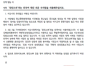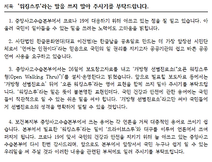 공공언어126 [공문] '트라우마'라는 외국어 대신 쉬운 우리말을 사용해주십시오. 받는 이 광주트라우마센터장함께 받는 이 제목 '트라우마'라는 외국어 대신 쉬운 우리말을 사용해주십시오. 1. 국가 폭력 피해자들의 아픔과 치유 활동에 힘쓰고 계신 점을 잘 알고 있습니다. 저희 단체 역시 이런 활동에 대해 지지를 보냅니다. 한 발 더 나아가, 기관 활동의 공감대를 넓히는 일에 동참하려는 뜻으로 이렇게 공문을 보냅니다. 2. 사단법인 한글문화연대(대표 이건범)는 한글날을 공휴일로 만드는 데 가장 앞장선 시민단체로서 ‘언어는 인권이다’라는 믿음으로 국민의 알 권리를 지키고자 공공기관 및 언론의 쉽고 바른 언어 사용을 요구하고 있습니다. 3. 트라우마센터라는 기관 이름에서 ‘트라우마’는 기관의 설립 목적인 ‘상처의 치유’라는 뜻과 정확히 일치하지 않습니다. 명확한 우리말로 바꿔주시거나 국민들이.. 2020. 5. 13. 한글 아리아리 770 한글문화연대 소식지 770 2020년 5월 7일 발행인 : 이건범 (한글문화연대 상임대표) 한글문화연대 바로가기 ◆ [우리말 이야기] 산돌림과 재넘이 - 성기지 운영위원 우리나라 사람들은 유난히 산을 좋아한다고 한다. 그래서인지 우리말에는 산등성이, 산마루, 산모롱이, 산모퉁이, 산봉우리, 산비탈, 산자락, 산줄기 같은, 산에 관한 토박이말들이 무척 많다. 이처럼 산을 떠올리게 하는 우리말 가운데 산돌림과 재넘이가 있다. 그러나 이들은 산의 일부를 가리키는 토박이말이 아니라, 각각 비와 바람의 이름이다. 산돌림은 ‘여기저기 옮겨 다니면서 한 줄기씩 내리는 소나기’를 가리키는 순 우리말이다. 본디는 산기슭으로 돌아가며 잠깐씩 내리는 소나기를 산돌림이라고 했을 것이다. 그러다가 이 비가 산 아래 마을로 옮겨.. 2020. 5. 8. [알림] '쉬운 우리말을 쓰자!' 누리집 여는 잔치 '쉬운 우리말을 쓰자!' 누리집(www.plainkorean.kr) 행사 안내 공공기관이 남용한 외국어 신고하시면편의점 상품권을 드립니다. [쉬운 우리말로 바꿔주세요] 게시판에 글을 쓰신 분 가운데 매주 50명을 뽑아 편의점 모바일 상품권(5000원권)을 선물로 드립니다. ▶ 기간:1차- 5/8~142차- 5/15~213차- 5/22~28 ▶ 발표: 매주 금요일 (5월 15일, 22일, 29일) 오후 4시 이후 '쉬운 우리말을 쓰자' 누리집에 발표.*당첨자에게는 개별 연락 드립니다. ▶ 참여 방법:1. 공공기관이 불필요하게 쓴 외국어를 찾는다.2. 사진을 찍어두거나 인터넷 주소를 복사한다.3. 쉬운 우리말을 쓰자! 누리집(www.plainkorean.kr) '신청하기' 게시판에 우리말로 바꾸고 싶은 외국.. 2020. 5. 6. [공문] '워킹스루'라는 외국어 대신 쉬운 우리말을 사용해주십시오. 받는 이 서울시장함께 받는 이 제목 '워킹스루'라는 외국어 대신 쉬운 우리말을 사용해주십시오. 1. 서울시의 우리말글 사랑을 바랍니다. 2. 사단법인 한글문화연대(대표 이건범)는 한글날을 공휴일로 만드는 데 가장 앞장선 시민단체로서 ‘언어는 인권이다’라는 믿음으로 국민의 알 권리를 지키고자 공공기관의 쉽고 바른 공공언어 사용을 요구하고 있습니다. 3. 4월 2일 기자회견에서 서울시장께서는 ‘워킹스루’라는 외국어를 사용하였습니다. 이 말은 질병관리본부에서 개방형(선별진료소)이라고 사용하고 있고 국립국어원에서도 도보 이동형(선별진료소)으로 바꿔 쓰길 권하고 있습니다. 이 같은 외국어 남용은 시민의 정책 이해를 가로막고 외국어 능력에 따라 시민의 알 권리를 차별할 위험이 있습니다. 게다가 ‘워킹스루’라는 말은.. 2020. 4. 3. [공문] '통째 격리'라는 우리말 사랑에 고마움을 밝힙니다. 받는 이 에스비에스(SBS) 남상석 보도본부장 ssnam@sbs.co.kr함께 받는 이 티비시(TBC) 서은진 기자 youtbc@naver.com 제목 '통째 격리'라는 우리말 사랑에 고마움을 밝힙니다. 1. 언론인으로서 외국어를 알기 쉽고 바른 우리말 표현으로 바꾸려 노력하고 계신 점을 잘 알고 있습니다. 한 발 더 나아가, 보도용어의 공공성을 높이는 일을 함께 일궈 가자는 뜻으로 이렇게 편지를 보냅니다. 2. 사단법인 한글문화연대(대표 이건범)는 한글날을 공휴일로 만드는 데 가장 앞장선 시민단체로서 ‘언어는 인권이다’라는 믿음으로 국민의 알 권리를 지키고자 공공기관 및 언론의 쉽고 바른 언어 사용을 요구하고 있습니다. 3. 에스비에스는 4월 1일에 ‘에스비에스 8 뉴스’ 중 ‘통째 격리’라는 자막을 .. 2020. 4. 3. [공문] '워킹스루'라는 말을 쓰지 말아 주시기를 부탁드립니다. 받는 이 보건복지부 코로나바이러스감염증-19중앙사고수습본부장 행정안전부 중앙재난안전대책본부장함께 받는 이 제목 '워킹스루'라는 말을 쓰지 말아 주시기를 부탁드립니다. 1. 중앙사고수습본부에서 코로나 19에 대응하기 위해 애쓰고 있는 점을 잘 알고 있습니다. 아울러 국민이 알아들을 수 있는 말을 쓰려는 노력에도 고마움을 밝힙니다. 2. 사단법인 한글문화연대(대표 이건범)는 한글날을 공휴일로 만드는 데 가장 앞장선 시민단체로서 ‘언어는 인권이다’라는 믿음으로 국민의 알 권리를 지키고자 공공기관의 쉽고 바른 공공언어 사용을 요구하고 있습니다. 3. 중앙사고수습본부에서는 26일에 보도참고자료를 내고 ‘개