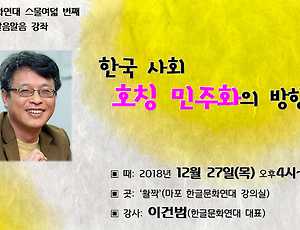 민주화2 [알림] 12월 알음알음 강좌(28) - 한국 사회 호칭 민주화의 방향/이건범 한글문화연대 대표 ■ 주제: 한국 사회 호칭 민주화의 방향 ■ 강사: 이건범(한글문화연대 대표) ■ 때: 2018년 12월 27일(목), 오후 4시~6시 ■ 곳: 활짝(마포 한글문화연대 강의실) ** 찾아오시는 길 더 자세히 보기 ■ 수강 신청 가기로드 중... 2018. 12. 6. 호칭 민주화, 이렇게 추진해 보자 - 이건범 상임대표 호칭 민주화,이렇게 추진해 보자. 이건범 한글문화연대 대표 1. 호칭 민주화가 필요한 사정 누구든 일터나 학교에서, 공공장소에서, 가게와 식당 같은 영업 장소에서, 동아리나 동호회 따위 사교 모임에서 다양한 사람들과 만나고, 말을 건네기 위해 그들을 부른다. 우리 사회에서는 이름만 부르는 건 낮잡아 보는 짓이라고 여기는 반면에 고민 없이 부를 수 있는 호칭이나 정교한 호칭 체계는 마땅치 않다. 그래서 호칭을 둘러싼 문제가 수없이 일어난다. 뭐라고 불리느냐에 따라 기분이 나쁘거나 할 말을 못하게 되는 경우가 생긴다. 스스로 이러저러하게 불리길 기대하는 호칭과 다를 때이다. 옛날에는 신분과 나이에 따라 위아래 구별이 뚜렷했고 사람들이 서로 맺는 관계가 단순해서 그에 걸맞은 높임말투와 호칭을 사용하면 별 문제.. 2017. 12. 28. 이전 1 다음