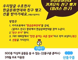 산돌구름3 옐로카펫 이야기 ‘옐로카펫? 레드카펫 친구?’ 옐로카펫을 우리말로 바꾼다는 말을 듣자 처음 들었던 생각이다. 큰 관심이 없다면 알기 어려운 외국어 중 하나다. 우리말가꿈이 19기 가나다 모둠은 아동과 청소년 주위에 어떤 외국어가 도사리고 있는지 살펴봤다. 그러다 발견한 게 ‘옐로카펫’이었다. 옐로카펫이란 어린이들이 횡단보도를 건너기 전 안전한 곳에서 기다리게 하고, 운전자가 쉽게 볼 수 있도록 하기 위해 바닥 또는 벽면을 노랗게 표시하는 것 이라는 게 초록창의 설명이다. 좀 더 알아보니 2016년, 한글문화연대에서 이 단어를 쉬운 우리말로 바꿔 달라고 말한 적이 있었다. 국제아동인권센터와 초록우산어린이재단에서 한창 옐로카펫을 설치하고 있었을 때 보냈지만 답변은 받지 못했다. 그로부터 4년 뒤에 우리말가꿈이에서 다시 불을.. 2021. 6. 22. [보도자료] 한글문화연대, 국제아동인권센터 '옐로카펫 우리말 이름 공모전' 개최 한글문화연대, 국제아동인권센터 ‘옐로카펫 우리말 이름 공모전’ 개최 - 아동안전구역 ‘옐로카펫’, 우리말 새이름 공모 한글문화연대와 국제아동인권센터는 5월 15일 ‘옐로카펫 우리말 이름 공모전’을 시작했다. 옐로카펫이란 '횡단보도 앞 바닥과 보도에 노란색 조형물을 설치하거나 칠해서 운전자가 이를 쉽게 인지하도록 하기 위한 교통안전 설치물'을 말한다. 첫걸음은 한글문화연대에서 이끄는 대학생 동아리 ‘우리말가꿈이’의 활동에서 시작됐다. 지난해 우리말가꿈이 19기 가나다 모둠은 초등학교 근처에 있는 옐로카펫을 알게 되었다. 외국어 이름인 옐로카펫을 이용하는 아동들 역시 대부분 뜻을 제대로 파악하지 못하는 것으로 드러났다. 안전용어는 알기 쉬운 우리말로 써야 한다는 생각으로 이름 저작권을 가지고 있는 국제아동인.. 2021. 5. 28. [알림]우리말글 수호천사 한글문화연대와 친구 맺고 선물 받아가세요.(9월15일까지) 한글문화연대 카카오톡 친구 맺기(플러스 친구) 우리말글 수호천사 한글문화연대와 친구 맺고 선물 받아가세요.(9월15일까지) * 방법은? 1. 카카오톡에서 "한글문화연대"를 검색, 항목에서 한글문화연대를 찾아 누른다. 2. "친구 추가"한다. 3. 1대 1 대화창에서 "안전 용어는 쉬운 말로"라고 적어 보낸다.(꼭!) 4. 선물을 기다린다. * 선물은? 500종 이상의 글꼴을 쓸 수 있는 3개월 무료 이용권 2017. 8. 17. 이전 1 다음