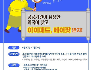 상품8 [행사] 난 빛나! 외국어 찾는 만큼! - 외국어 찾고 치킨 상품권 챙겨가자! 난 빛나! 외국어 찾는 만큼! 빛나는 우리말을 지키기 위해 남용되고 있는 외국어를 찾아서 알려주세요! 치킨 상품권, 10만 원 상품권 등 푸짐한 선물을 드립니다! 공공기관에서 남용한 외국어를 찾아 게시판에 올려주세요. -> 바꿔주세요 게시판 바로가기 ▶ 기간: 2023년 3월 31일(금) ~ 4월 27일(목) -4주- ▶ 발표: - 반짝상: 매주 금요일(매주 발표, 총 4번 선발) - 빛나상: 2023년 4월 28일(금) *쉬운 우리말을 쓰자 누리집 '공지' 게시판에 공지합니다. *수상자에게는 개별 연락 드립니다. ▶ 시상: 반짝상 / 빛나상 두 분야로 시상합니다. (반짝상, 빛나상 총 13명 시상) - 반짝상: 매주 최다 제보자를 상위 5등까지 공개/ 그 중 상위 2명 시상 - 반짝일, 반짝이: 뿌링클.. 2023. 4. 18. [알림] 외국어 신고하세 행사 안내 세종 나신 날 기념 ▷ 외국어 신고하세 공공기관에서 쓴 외국어 찾고 상품 받자! -> 바꿔주세요 게시판 바로가기 ▶ 기간: 2022년 05월 09일(월) ~ 6월 12일(일) -6주- [으뜸, 보람, 버금상] 5월 9일(월) ~ 6월 12일(일) [주간 행운상] * 6주간 계속됩니다. - 화요일 ~ 다음주 월요일 23:59까지 (예: 5월 9일부터 5월 16일까지) *주간 행운상은 쉬운 우리말을 쓰자 누리집 '공지' 게시판에, 최종 수상자는 '공지' 게시판과 한글문화연대 누리집에 공지합니다. *수상자에게는 개별 연락을 드립니다. ▶ 시상: - 으뜸상(2명): 무선 헤드셋 - 버금상(2명): 10만 원 상품권 - 보람상(10명): 5만 원 상품권 *6월 15일에 발표하며, 최소 게시글 30건 이상이어야 선.. 2022. 5. 24. 외국인도 모르는 '패브릭랩', 보자기였어? - 김민서 기자 외국인도 모르는 ‘패브릭랩’, 보자기였어? 한글문화연대 대학생 기자단 8기 김민서 기자 alstj2069@naver.com 최근 인터넷 서점 ‘알라딘’이 22주년을 기념하여 윤예지 작가와 함께 기획 상품(굿즈)를 선보였다. 자연과 생명체를 주제로 한 다양한 기획 상품을 내보였는데, 그중 ‘패브릭랩’(Farbric Wrap) 상품이 외국어 남용 논란으로 판매가 중단되었다. 알라딘은 해당 상품명 앞에 ‘선물할 때, 책이나 도시락, 물병을 보호할 때 사용하는’이라는 말을 덧붙이며 패브릭랩을 설명했다. ‘패브릭랩’은 직물, 천을 뜻하는 패브릭(fabric)과 싸다, 포장하다를 의미하는 랩(wrap)의 합성어일 것으로 보인다. 해당 합성어는 사용되지 않는 영어 단어일뿐더러, ‘보자기’ 또는 ‘보따리’와 같은 우리.. 2021. 8. 2. [알림] '쉬운 우리말을 쓰자!' 누리집 11월 행사 중앙행정기관이 쓴 외국어 소탕 작전! 외국어 남용 신고하고 아이패드 받자! 중앙행정기관이 남용한 외국어를 가장 많이, 그리고 잘 찾은 사람을 선정하여 상품을 드립니다. ▶ 기간: 2020년 11월 11일 ~ 12월 14일 ▶ 발표: 12월 18일 (금)*쉬운 우리말을 쓰자 누리집 '알림 게시판'과 한글문화연대 누리집에 공지 예정*수상자에게는 개별 연락 드립니다. ▶ 시상:- 으뜸상(1명) 아이패드 8세대 128GB *최소 게시글 수 50개- 버금상(2명) 에어팟 2세대 *최소 게시글 수 50개- 보람상(3명) 상품권 5만 원 *최소 게시글 수 20개- 행운상(20명) 편의점 모바일 상품권 5천 원 *최소 게시글 수 1개 ▶ 참가 방법:1. 중앙행정기관이 불필요하게 쓴 외국어를 찾는다.2. 찾은 외국어가.. 2020. 11. 18. [알림] 쉬운 우리말을 쓰자! 누리집 6월 행사 안내 우리말을 지키는 외국어 수사대를 찾습니다! 공공기관이 남용한 외국어 찾고 아이패드, 에어팟 받자! 공공기관이 남용한 외국어를 가장 많이, 그리고 잘 찾은 사람에게 '우리말 지키는 외국어 수사대'의 수사관으로 임명하며 상품을 드립니다. ▶ 기간: 6월 10일 ~ 7월 20일 ▶ 발표: 7월 24일 (금)*쉬운 우리말을 쓰자 누리집 '알림 게시판'과 한글문화연대 누리집에 공지 예정*당첨자에게는 개별 연락 드립니다. ▶ 시상:- 으뜸수사관상(1명) 아이패드 7세대 128GB *최소 게시글 수 50개- 버금수사관상(3명) 에어팟 2세대 *최소 게시글 수 50개- 보람수사관상(20명) 문화상품권 3만원 *최소 게시글 수 10개- 행운상(20명) 편의점 상품권 5천원 *최소 게시글 수 1개 ▶ 참가 방법:1. 공공.. 2020. 6. 10. 기획) 여주한글시장을 찾다 ③-여주한글시장, 그 발전의 끝 - 김태완 기자 (기획기사) 여주한글시장을 찾다 ③-여주한글시장, 그 발전의 끝 한글문화연대 대학생 기자단 6기 김태완 기자tw.x4vier@gmail.com 여주 한글시장은 정부의 문화관광형 육성산업의 지원 대상으로 지난 3~4년간 투자를 받았다. 시장 입구에서부터 한글 간판이나 세종대왕 동상, 벽화, 길거리 및 구역마다 볼 수 있는 한글 관련 조형물 등이 그 투자의 결과물이다. 과거 ‘여주중앙통’으로 불리는 때보다 발전한 것은 분명하다. 하지만 투자 성과가 과연 있는지는 의문이다. 낙후된 건물들부터 젊은 세대의 눈길을 사로잡을 내용이 부족하기 때문이다. 기성세대를 위한 옷 가게, 어디서나 쉽게 볼 수 있는 미용 및 잡화점이 대부분이었다. 사람들을 끌어당기는 요소가 충분하지 못한 것이다. 거리를 활보하며 취재하던 중 .. 2019. 8. 28. [13기] 모둠 활동 소식/화장품 이름 공모전 어려운 화장품 용어를 여러분이 직접 바꿀 수 있는 기회가 왔습니다! 우리말 사랑도 