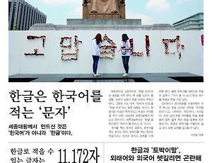 신문6 [알림] 한글문화연대 20주년 되는 해입니다. 한글문화연대 대표 이건범입니다. 새해 복 많이 받으세요. 2019년엔 공공언어를 쉬운 말로 쓰자는 운동을 아주 열심히 펼쳤습니다. 중앙정부에서 내는 보도자료를 이잡듯이 뒤져서 쓸데없이 외국어를 사용한 공무원에게 일일이 공문을 보내 개선을 권하였고, 20개 신문과 방송 기사에 대해서도 분석하고 개선을 부탁하였습니다. 감시활동에 여러 회원님이 함께 해주셔서 더더욱 보람이 컸습니다. 아주 획기적이지는 않더라도 많이 바뀌었고, 공공언어를 쉬운 말로 써야 한다는 의식은 널리 퍼지는 것 같습니다. 더구나 저희 활동에 힘을 얻은 문화체육관광부에서 공공언어 개선 사업에 깊이 뛰어들어 우리 연대와 힘을 합쳐 사업을 넓히고 있습니다. 꾸준히 해 나가겠습니다. 앞으로 2~3년 정도 더 노력하면 꽤 좋은 결과를 얻으리라 믿습.. 2020. 1. 2. 기획) <어려운 정치용어, 변화가 필요해...>-1 영어와 한자어가 난무하는 정치용어 - 송은혜, 이강진 기자 (기획기사) -1 영어와 한자어가 난무하는 정치용어 한글문화연대 대학생 기자단 6기 송은혜 기자 song12358@naver.com 한글문화연대 대학생 기자단 6기 이강진 기자 rkdwls1348@naver.com 어려운 정치용어를 설명도 하지 않고 전하는 방송 뉴스와 기사가 많아졌다. 인터넷 실시간 검색어 순위를 보면 정치용어가 자주 올라오는데 ‘비례대표제’와 ‘필리버스터’가 대표적이다. ‘비례대표제’는 각 정당의 득표수에 비례하여 당선자 수를 결정하는 선거제도이며, ‘필리버스터’는 소수파가 다수파의 독주를 막기 위해 합법적인 수단을 써서 의사 진행을 고의로 방해하는 행위를 말한다. 이렇게 뉴스나 신문에서 자주 보고 듣지만, 외국어나 한자어라서 뜻을 알기 어려운 정치용어에는 또 어떤 것들이 있을까? 영.. 2019. 9. 16. 한자를 뒤섞은 ‘한국’ 신문, 이래도 되나요?-박다영 기자 한자를 뒤섞은 ‘한국’ 신문, 이래도 되나요? 한글문화연대 대학생 기자단 5기 박다영 기자 ghj38070@nate.com ‘특사단, 김정은 만나 '經協 친서' 전달’ 9월 6일 조선일보 1면에 실린 기사 중 하나의 제목이다. 한글로 풀어 쓰면 ‘특사단, 김정은 만나 '경제협력 친서' 전달’이다. 그러나 풀어쓰기 전의 제목을 본 사람들 가운데 일부는 ‘經協’이 무엇을 뜻하는지 쉽게 파악할 수 없다. 한글이 아닌 어려운 한자가 쓰였기 때문이다. ‘經協’의 ‘지날 경/글 경(經)’과 ‘화합할 협(協)’의 난이도는 둘 다 한자 급수 읽기 4급의 2(II), 쓰기 3급의 2(II)이다. 8급부터 시작하는 한자 급수에서 읽기로는 7단계, 쓰기로는 9단계나 높아 한자에 익숙하지 않은 사람에겐 매우 어려운 한자다. .. 2018. 9. 27. 신문과 한글은 떼려야 뗄 수 없는 사이-김지현 기자 신문과 한글은 떼려야 뗄 수 없는 사이 한글문화연대 대학생 기자단 3기 김지현 기자 k1223k@naver.com 신문은 송신자가 불특정 다수인 ‘대중’에게 정보를 전달하는 매체다. 이는 대중매체 중 가장 오래된 매체로 꼽을 수 있다. 그렇기 때문에 한글이 대중적으로 사용되기 이전부터 신문은 존재했다. 이에 필자는 우리나라에서 신문에 언제부터 한글을 사용하기 시작했는지 궁금해졌다. 간혹 필요에 따라 로마자나 한자를 쓰는 것 외에 한글을 주로 쓰는, 한글 방식으로 말이다. 궁금증을 풀기 위해 서울특별시에 위치한 ‘신문박물관’으로 직접 찾아가 신문과 한글의 관계를 알아보기로 했다. 신문박물관은 어떤 곳? 신문에서의 한글의 관계에 대해 찾아보기 전, 필자가 다녀온 신문박물관에 대해 먼저 알아보자. 신문박물관은.. 2016. 10. 20. 570돌 한글날! "한글 사랑해" 신문 570돌 한글날! "한글 사랑해" 신문 우리가 알아야 할 우리말과 한글에 대한 이야기를 담았습니다. 2016. 10. 13. “찻잔 속의 태풍”은 바른 말일까? [아, 그 말이 그렇구나-51] 성기지 운영위원 신문 정치면이나 경제면에서 가끔 “찻잔 속의 태풍”이란 표현을 볼 수 있다. 어떤 사건이 특정한 상황에 태풍처럼 큰 영향을 줄 것으로 기대되었지만, 실제로는 그 위력이 약해서 그 일에 별 영향을 미치지 못할 경우에, 이를 ‘찻잔 속의 태풍’으로 비유한다. 여기에서 ‘찻잔 속’이란 말이 올바른 표현인지 의심하는 사람은 많지 않다. 가령, 차를 달인 물이 가득 든 찻잔에 반지가 빠졌다는 것을 어떻게 말할 수 있을까? “찻잔 속에 담긴 찻물 속에 반지가 빠졌다.”고 하면 아무래도 어색하게 들릴 것이다. 바로 여기에서 우리는 ‘속’과 ‘안’의 차이를 구별할 필요를 느낀다. ‘속’과 ‘안’은 뜻이 다른 말이다. 흔히 “유리컵 속에”, “밥그릇 속에” 하고 말하는데,.. 2014. 8. 14. 이전 1 다음