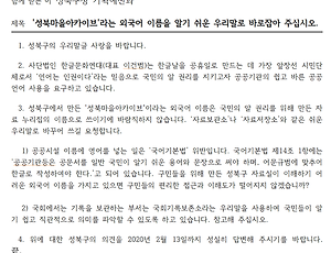 아카이브21 한글 아리아리 757 한글문화연대 소식지 757 2020년 2월 6일 발행인 : 이건범 (한글문화연대 상임대표) 한글문화연대 바로가기 ◆ [우리말 이야기] 후출하다 - 성기지 운영위원 우리말에 ‘후출하다’가 있다. 요즘 말글살이에서는 낯설게 느껴지는 말이다. 매우 배가 고픈 상태를 나타내는 말인데, 이 말의 쓰임을 온전히 이해하고자 말밭을 헤쳐 나가다 보면 맨 끝에서 ‘촐촐하다’를 만날 수 있다. 끼니 때가 다가오면서 ‘배가 조금 고픈 느낌’이 있을 때 ‘촐촐하다’고 한다. “점심 때가 다가오니 촐촐하네.”로 표현할 수 있는 것이다. 더 시간이 지나 ‘배가 고픈 느낌’(‘조금’이 빠졌다.)이 들면 ‘출출하다’고 한다. “점심을 거르니 출출하네.”에서 볼 수 있듯이, 이 ‘출출하다’가 배가 고픈 느낌을 가장 일반적으로 나타내는.. 2020. 2. 7. [공문] '성북마을아카이브'라는 외국어 이름을 알기 쉬운 우리말로 바로잡아 주십시오. 받는 이 성북구청장 이승로함께 받는 이 성북구청 기획예산과 제목 '성북마을아카이브'라는 외국어 이름을 알기 쉬운 우리말로 바로잡아 주십시오. 1. 성북구의 우리말글 사랑을 바랍니다. 2. 사단법인 한글문화연대(대표 이건범)는 한글날을 공휴일로 만드는 데 가장 앞장선 시민단체로서 ‘언어는 인권이다’라는 믿음으로 국민의 알 권리를 지키고자 공공기관의 쉽고 바른 공공언어 사용을 요구하고 있습니다. 3. 성북구에서 만든 '성북마을아카이브'이라는 외국어 이름은 국민의 알 권리를 위해 만든 자료 누리집의 이름으로 쓰이기에 바람직하지 않습니다. ‘자료보관소’나 ‘자료저장소’와 같은 쉬운 우리말로 바꾸어 쓰길 요청합니다. 1) 공공시설 이름에 영어를 넣는 일은 ‘국어기본법’ 위반입니다. 국어기본법 제14조 1항에는 ‘.. 2020. 2. 3. 생활 속에서 우리말 사용하기- 디지털 한글 박물관의 선동 - 노민송 기자 생활 속에서 우리말 사용하기 - 디지털 한글 박물관의 선동 한글문화연대 대학생 기자단 3기 노민송 기자 amy0360@naver.com ‘하이’, ‘땡큐’, ‘핸드백’. 우리에게 너무 익숙한 단어이다. 우리말이 있어야 할 곳에 당당히 자리를 차지하고 있는, 너무나도 익숙한 ‘외국어’이다. 우리가 자각하지 못하는 새에 외국어는 우리말 속에 침투되어 서서히 한글을 파괴하고 있다. ‘코레일’, ‘서울 메트로’ ···. 그 현실을 단적으로 나타내는 단어들이다. 우리말 사용을 독려해야 할 공공기관이 외국어를 더 사용하는 실태, 참으로 문제다. 요즘 우리말에 관한 가장 큰 문제는 자주 사용하는 단어를 외국어가 대신하고 있는 점이다. 이런 문제를 일찍이 파악하고 한글에 관련된 지식과 정보를 누구나 쉽게 검색하여 이용.. 2016. 7. 26. 이전 1 2 3 다음