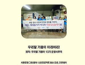 자동심장충격기9 [공문] Safe Korea, AED 대신 쉬운 우리말을 사용해주십시오. 받는 이 서울 종로소방서 제목 Safe Korea, AED 대신 쉬운 우리말을 사용해주십시오. 1. 시민의 생명과 안전을 지키는 데 늘 힘쓰고 계신 점을 잘 알고 있으며, 저희 단체 역시 지지와 감사의 마음을 전합니다. 2. 사단법인 한글문화연대(대표 이건범)는 한글날을 공휴일로 만드는 데 가장 앞장선 시민단체로서 ‘언어는 인권이다’라는 믿음으로 국민의 알 권리를 지키고자 공공기관 및 언론의 쉽고 바른 언어 사용을 요청하고 있습니다. 3. 종로소방서 정문과 후문에 쓰여 있는 Safe Korea라는 구호를 우리말 구호로 바꿔 써 주십시오. 한글문화연대에서는 시민의 제보를 받아 Safe Korea 구호에 대해 2021년 4월 9일 소방청에 문의하였으며, 소방청에서는 “119의 약속 Safe Korea라는 외.. 2021. 5. 3. [아주경제] ‘중요한 안전과 소통’ 위해...뜻 모를 외래어 바꾸기 위한 노력들 - 2021.04.30 - 문체부·국어문화원연합회, ‘쉬운 우리말 쓰기 사업’ 진행 - 한글문화연대, ‘Kiss & Ride’ 표기 ‘환승정차구역’으로 다듬어 “블랙 아이스 조심하세요.” 말은 위험을 빨리 알아차릴 수 있도록 돕는 역할을 한다. 하지만 뜻 모를 외래어는 이를 방해할 수 있다. “도로 살얼음 조심하세요”라는 쉬운 우리말을 사용하는 일은 안전을 위해서 매우 중요하다. 문화체육관광부를 비롯한 (사)국어문화원연합회 등은 누구나 쉽고 바른 언어를 사용할 수 있도록 어려운 말이나 낯선 외국어를 다듬고 쉬운 말을 널리 알리는 ‘쉬운 우리말 쓰기 사업’을 진행하고 있다. (중략) 한글문화연대는 국민의 안전과 재산, 권리와 의무, 기회와 행복을 좌우하는 공공언어에서 외국어 대신 쉬운 우리말을 사용해 국민의 알 권리를 보호하는 .. 2021. 4. 30. [민원/답변] '지하철 화면에 송출되는 영상에 'AED'라는 표현 대신 '자동심장충격기', '심장충격기'라는 쉬운 우리말을 사용해주십시오 안녕하십니까? 귀하께서 서울시응답소를 통해 신청하신 민원(접수번호 20210125905165)에 대한 검토 결과를 다음과 같이 알려드립니다. 귀하의 민원 내용은 "지하철 공익홍보 영상 수정 요청"에 관한 것으로 이해됩니다. 귀하의 요청사항에 대해 검토한 의견은 다음과 같습니다. 가. 서울 지하철 1~8호선, 9호선 2, 3단계를 운영하는 서울교통공사에서는 시민 여러분의 '안전, 편의'를 위하여 다양한 공익 홍보 주제를 역사와 열차 내에서 홍보하고 있습니다. 나. 귀하의 소중한 의견에 감사드립니다. 귀하의 의견을 반영하여 해당 영상에 '자동 심장충격기'와 'AED'를 병기하여 수정 후 송출할 수 있도록 하겠습니다. 귀하의 민원에 만족스러운 답변이 되었기를 바라며, 답변 내용에 대한 추가 설명이 필요한 경우.. 2021. 1. 29. [민원] '지하철 화면에 송출되는 영상에 'AED'라는 표현 대신 '자동심장충격기', '심장충격기'라는 쉬운 우리말을 사용해주십시오 제목 : '지하철 화면에 송출되는 영상에 'AED'라는 표현 대신 '자동심장충격기', '심장충격기'라는 쉬운 우리말을 사용해주십시오 처리 기관 : 서울특별시 (서울교통공사 미디어실) 1. 사단법인 한글문화연대(대표 이건범)는 한글날을 공휴일로 만드는 데 가장 앞장선 시민단체로서 ‘언어는 인권이다’라는 믿음으로 국민의 알 권리를 지키고자 공공기관의 쉽고 바른 공공언어 사용을 요구하고 있습니다. 2. AED는 한글문화연대에서 운영하는 대학생 동아리 '우리말가꿈이'에 의해 2015년 서울시 대부분의 지하철역에 AED라는 표현과 함께 '자동심장충격기'라는 용어도 같이 표기되어있습니다. 하지만 2021년 1월 25일 지하철 화면에 'AED'라는 표현만 사용하여 '자동심장충격기'의 안내 영상이 나오는 것을 발견했습.. 2021. 1. 29. 우리말 가꿈이 13기 <카드뉴스> 2017. 9. 14. 비상사태에 마주하는 로마자 표기 - 이지은 기자 비상사태에 마주하는 로마자 표기 한글문화연대 대학생 기자단 3기 이지은 기자 freeloves84@hanmail.net “김한글양은 대학의 새로 지은 건물에서 친구와 만나기로 약속했다. 학교에 도착한 그녀는 ‘P’의 ‘AUTO PAY STATION’ 옆의 ‘SMOKING ZONE’의 학생들에게 길을 물어보았다. 김한글양은 ‘Elevator’를 타고 ‘3F’로 올라갔다. 앗, 친구와 만나기로 한 ‘Study Room’은 ‘2F’에 있었다. ‘3F’에는 ‘Class Room’뿐이었다. 김한글양은 ‘Woman Toilet’을 잠시 들린 뒤, ‘information’을 확인하고 ‘2F’로 내려가 친구가 있는 ‘Study Room’의 문을 ‘PUSH’ 했다.” 위 글은 대학생인 김한글양이 잠시 겪게 되는 상황을 .. 2016. 11. 29. [논평] ‘자동 심장충격기’라는 쉬운 말을 선택한 국회 결정을 환영한다. [논평] ‘자동 심장충격기’라는 쉬운 말을 선택한 19대 국회의 결정을 환영한다. 한글문화연대에서는 19대 국회에서 자동제세동기라는 말을 국민이 이해하기 쉬운 말인 자동 심장충격기로 바꾼 결정을 두 손 번쩍 들어 환영한다. 5월 19일, 19대 국회 마지막 본회의에서 국회 보건복지위원장이 제안한 ‘응급의료에 관한 법률 일부 개정 법률안’이 참석한 모든 국회의원 찬성으로 통과되어, 응급의료에 관한 법률 제16조, 21조, 36조, 47조, 63조에 사용되던 자동제세동기라는 어려