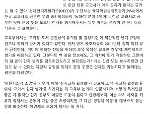 초등교과서 한자병기 반대 국민운동본부3 [영상]한자교육 관련 공청회(2015.08.24.한국교원대학교) 한자교육 관련 사기공청회(2015.08.24.) 2015. 9. 10. 한자 Vs. 漢字-문화방송 시사매거진2580 595회(2015.09.06.) 문화방송 시사매거진2580 595회(2015.09.06.) 초등학교 3학년 교과서에 한자를 함께 쓰자는 소위 한자 병기를 둘러싸고 논란이 뜨겁다. 교육부의 이같은 방침이 확정되면 1970년 이후 48년 만에 초등학교 교과서에 다시 한자가 등장하게 되는 것인데.. 한자를 일찍부터 가르쳐야 한다는 쪽과 아이들의 학습 부담만 가중시킬 뿐이라는 쪽이 첨예하게 맞서는 가운데 교육부가 마련한 공청회는 양측의 충돌로 난장판이 되어 버렸다. 한 편에선 한자 병기 방침이 나오자 벌써부터 한자 사교육 열풍의 조짐도 벌어지고 있는데.. (http://imbbs.imbc.com/metaview.mbc?bid=sisa2580_clip&list_id=3172319) 2015. 9. 7. [한국일보/기고]교과서 한자 병기, 추진 근거가 없다 교과서 한자 병기, 추진 근거가 없다 이건범 한글문화연대 대표 * 이 글은 2015년 8월 30일, 한국일보에 실렸습니다. (http://www.hankookilbo.com/v/79dc74569a984fd0b437a1f657628174) 교육부에서 초등 교과서 한자 병기 방침을 검토하겠다고 밝힌 지 벌써 열 달이 지났다. 발표 직후부터 연구진을 꾸려 연구하겠노라고 말했지만 98%의 초등학교에서 한자교육을 시킨다고 해놓고 몇 시간이나 가르치고 얼마나 많은 양을 다루는지 조사한 것도 없다. 발표 전이나 후에나 연구다운 연구가 한 건도 없다. 그리고 결정의 시기는 한 달 앞으로 다가왔다. 한자 병기는 교육 전반의 문제이기도 하지만 이를 넘어서 우리 문자 생활에 큰 혼란을 부를 일인데, 이렇게 구렁이 담 넘어가.. 2015. 9. 1. 이전 1 다음