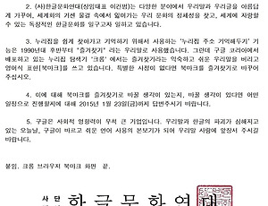 한글문화연대1472 우리말 가꿈이7기 마침마당(2015.01.03.) [대학생 연합 동아리 '우리말 가꿈이' 7기 마침마당] - 때: 2015년 1월 3일(토) - 곳: 가톨릭청년회관 니꼴라오홀 - 수료 인원: 150여명 2015. 1. 19. 구글 코리아는 '북마크'를 '즐겨찾기'로 고쳐주십시오. 인터넷에서 다시 가고 싶은 누리집 주소를 등록해놓고, 나중에 등록해놓은 목록에서 쉽게 바로 찾아 갈 수 있도록 하는 기능을 "즐겨찾기"라고 합니다. 그런데 구글 코리아 크롬에서는 누구나 쉽게 알 수 있는 우리말인 "즐겨찾기" 대신 "북마크"를 쓰고 있어 아래와 같이 개선 요청을 했습니다. 2015. 1. 16. 아내에 대하여 [아, 그 말이 그렇구나-72] 성기지 운영위원 아내에 대하여 ‘아내’에는 우리 선조들의 남성 중심적 사고가 묻어 있다. 본디 ‘안해’라고 하다가 소리 나는 대로 ‘아내’로 굳어진 말인데, ‘안’은 집안일을 돌보기 때문에 붙인 말이고, ‘해’는 ‘것’을 뜻하는 우리말로 소유를 나타낸다. 집안일을 돌보는, 남자의 소유물이라는 뜻으로 만들어졌다고 생각된다. 그러나 옛날에도 요즘과 마찬가지로 부부의 나이가 중년을 넘어서게 되면 집안에서 아내의 위치가 올라가게 되었다. 그래서 ‘여편네’나 ‘아내’라는 말이 ‘마누라’로 달라지게 된다. ‘마누라’는 원래 높이는 말이었기 때문에, 나이가 지긋한 아내를 다정하게 부를 때 쓰는 호칭어로 사용되어 왔다. 그러다가 현대에 와서는 ‘아내’나 ‘마누라’의 쓰임이 완전히 달라졌.. 2015. 1. 16. [영상] 우리말사랑동아리 2기 뽐내기 대회 2014년 11월 22일 서울 하자 에서 있었던 우리말 사랑 동아리 2기 뽐내기 대회 모습을 영상으로 전합니다. 일년간 열심히 활동한 우리말 사랑 동아리 친구들의 모습을 살펴 볼 수 있는 알찬 시간이었습니다. 2015. 1. 6. '연임'과 '중임' [아, 그 말이 그렇구나-70]성기지 운영위원 뜻 구별이 쉽지 않은 말들 가운데 '연임'과 '중임'이 있다. 선거에 나오는 후보들의 이력 사항을 살펴보면, 어떤 직책에 대하여 연임했다는 표현과 중임했다는 표현이 따로 나타나고 있는 것을 볼 수 있다. 실제 일상생활에서도 동창회나 친목회 회칙을 만들 때, 연임과 중임이 혼동되는 경우가 있다. 가령 회장이 임기를 마친 뒤, 다시 또 회장을 맡는 것을 연임이라 하는 사람도 있고 중임이라 하는 사람도 있다. 이 경우에는 연임이라고 써야 한다. '연임'은 정해진 임기를 마친 뒤에 다시 거듭하여 그 임기의 직에 머무르는 일을 말한다. 예를 들면, "현행 헌법은 대통령의 연임을 금하고 있다."와 같이 쓰는 것은 올바른 표현이다. 이번에 이건범 님이 한글문화연대 대표를.. 2014. 12. 29. '넘어지다'와 '쓰러지다' [아, 그 말이 그렇구나-69]'넘어지다'와 '쓰러지다'/성기지 운영위원 길가에 베어져서 눕혀 있는 나무들을 가리켜 “나무가 쓰러져 있다.”고 말하는 이들이 있는가 하면, “나무가 넘어져 있다.”고 말하는 이들도 있다. 몸이 균형을 잃고 바닥에 닿는 상태를 가리킬 때 상황에 따라 ‘넘어지다’ 또는 ‘쓰러지다’라고 말한다. 엄밀히 구별해 보면, ‘넘어지다’는 발바닥을 제외한 몸의 일부가 바닥에 닿는 상태를 뜻한다. 가령 “돌부리에 걸려 넘어졌다.”고 하는데, 이를 “돌부리에 걸려 쓰러졌다.”고 하지는 않는다. 이에 비해, ‘쓰러지다’는 몸 전체가 길게 바닥에 닿는 상태다. “과로로 쓰러졌다.”라는 말을 “과로로 넘어졌다.”로 표현할 수는 없다. 마찬가지로, 완전히 베어져서 길가에 누워 있는 나무를 가리켜 .. 2014. 12. 19. 경찰에게 보도자료 잘 쓰는 요령 가르쳐 경찰에게 보도자료 잘 쓰는 요령 가르쳐 한글문화연대가 쉽고 바른 공공언어 쓰기 현장 교육에 나섰다. 이건범 대표와 김명진 운영위원, 노경훈 연구실장은 2014년 11월 21일 금요일 낮 2시에 서대문에 있는 경찰청을 방문하여 경찰청 실무자 40명에게 보도자료 잘 쓰는 방법을 가르쳤다. 이날 교육은 세 가지 원칙과 여덟 가지 요령, 실습 순으로 꾸려졌다. 강의의 첫 부분을 맡은 이건범 대표는 인터넷이 나타나는 바람에 20년 전과 비교해 언론사에 들어오는 보도자료 양이 2~30배 가량 늘었다는 점을 강조하였다. 이에 보도자료를 쓸 때 제목을 잘 뽑아야 하며, 쉽고 명료하게 글을 쓰고, 욕심을 버리고 쓸 것만 쓰라는 세 가지 큰 원칙과 그에 딸린 여덟 가지 요령을 설명했다. 뒤이어 노경훈 공공언어연구실장은 경.. 2014. 11. 28. 굉장히 추워요 [아, 그 말이 그렇구나-66] 성기지 운영위원 소설을 앞두고 벌써 한겨울에 접어든 느낌이다. 요즘 날씨가 꽤 추워졌는데, 추운 날씨를 표현할 때 우리는 “어유, 오늘 아침은 굉장히 추워요.”라고 말하는 경우가 흔히 있다. 그러나 이 말은 바람직한 표현이 아니다. ‘굉장히’라는 말은 크고 으리으리한 모양을 나타낼 때 쓰는 말이다. 곧 “굉장히 큰 집이다.”, “굉장한 규모의 도시이다.” 또는 “키가 굉장히 큰 학생이다.”라고 말할 때에 쓰는 것이다. 그러니까, 아주 작다는 뜻으로 “굉장히 작네요.”라든지, 아주 가볍다는 뜻으로 “보기보다 굉장히 가벼워요.”라는 말은 모두 올바른 표현이라고 할 수 없다. 이때에는 각각 “매우 작네요.”, “보기보다 