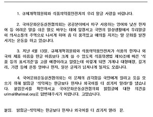 한글문화연대1472 식품의약품안전처는 한글보다 한자나 외국어를 더 섬기지 말라! 식품의약품안전처는 한글보다 한자나 외국어를 더 섬기지 말라! 지난 4월 13일, 규제개혁위원회와 식품의약품안전처가 식품의 한자나 외국어 제품 이름을 한글 이름보다 크게 쓸 수 있도록 식품위생법 제10조에 따른 '식품 등의 표시기준'을 고칠 예정이라고 알렸습니다. 이렇게 되면 가게나 대형매장, 길거리, 가정 등에 온통 영어나 한자, 일본 글자가 넘쳐날지도 모릅니다. 문제의 심각함을 국민에게 알리고 뜻을 모으기 위해 우리 한글문화연대가 사무국을 맡고 있는 국어문화운동실천협의회 이름으로 밝힘글(성명서)를 내고 식품의약품안전처와 규제개혁위원회, 국무총리실에 공문을 보냈습니다. 2014. 4. 23. 방송사는 세월호 사태를 보도할 때 어려운 용어를 쉬운 우리말로 바꾸고 하나로 통일해 사용해주세요. [공문] 세월호 사태를 보도할 때 어려운 용어를 쉬운 우리말로 바꾸어 사용해주세요. 방송 관계자들이 세월호 사태를 보도하느라 애쓰고 있지만 우리말 사용에 대한 아쉬운 점이 있어 방송사에 공문을 보냈습니다.(문화방송, 서울방송, 연합뉴스, 와이티앤, 제이티비씨, 채널에이, 티브이조선, 한국방송) - 내용: 사고의 실체나 구조 현황에 깊은 관심을 갖고 있는 국민에게 소식을 전하는 방송에서 통일되지 않은 용어와 외국어를 남발하여 혼란을 부추길 위험이 있습니다. 아래 말들을 쉬운 우리말로 바꾸어 모든 방송에서 하나로 사용해 주시면 좋겠습니다. * 안내줄: 가이드 라인, 유도선 * 배안 공기층: 에어 포켓 * 구명조끼: 라이브 자켓 2014. 4. 22. 대학생 기자단 마지막 수업, 한글가온길을 걷다 한글문화연대 대학생 기자단과 우리말 가꿈이 홍보지원단은 5주에 걸쳐 진행한 기자 수업을 마치고 한글 가온길을 찾았다. 한글가온길은 한글이 창제된 경복궁, 한글을 지켜온 한글학회와 주시경 선생이 살던 집터, 글자마당 등의 광화문 일대를 말한다. '가온'은 '가운데', '중심'을 뜻하는 토박이 말이다. 우리는 광화문역 8번 출구에서 한글 가온길을 함께 걸을 동무와 가온길 설명을 해 주실 김슬옹 교수님을 만났다. 김슬옹 선생님께서는 제일 먼저 세종대왕이 한글을 만든 까닭과 어떻게 어떤 원리로 만들었는지를 알려주셨다. 한글은 음양오행과 하늘 땅 사람의 모양을 본떠 만든 철학을 담은 문자라고 하셨다. 닿소리 기본글자인 'ㄱㄴㅁㅅㅇ'은 '목화토금수' 음양오행과, 하늘의 둥근 모양, 땅의 평평한 모양, 사람이 서 있.. 2014. 4. 19. 하얀 목련이 질 때는 [우리 나라 좋은 나라-28] 김영명 공동대표 더럽다. 하얀 목련이 질 때는 더럽다. 보랏빛 목련이 질 때는 지저분하다. 청초하고 화려하며 우수에 깃든 아름다운 목련이 질 때, 누렇게 변한 꽃잎이 하나씩 둘씩 뚝뚝, 그리고 너저분하게 떨어진다. 그러나 불평하지 말자. 청초한 꽃봉오리도 목련이고 지저분한 꽃잎도 목련이다. 하나는 목련이고 다른 하나는 목련의 죽음이다? 아니다. 둘 다 목련이다. 목련을 사랑한다고 감히 말하는 사람이여, 그대는 이 둘을 다 같이 사랑해야 한다. 아니 꼭 그래야 하는 철칙은 없다. 다만 그냥 그랬으면 좋겠다는 말이다. 매미는 한여름 화려한 탈바꿈으로 우렁찬 울음을 울기 위해 7년 동안의 굼벵이 시절을 이겨낸다고 한다. 그런데 누가 그러던가? 굼벵이한테 누가 물어봤나? 너는 화려.. 2014. 4. 17. [보도자료]한글문화연대, 한글날 맞아 언어정책 국제회의 열어(2013.10.07.) 한글문화연대, 한글날 맞아 언어정책 국제회의 열어 - 쉬운 언어 정책과 자국어 보호 정책의 만남 2013.10.07.월. 2005년에 국경일이 된 한글날을 올해부터는 공휴일로 지내며 기리게 되었다. 한글문화연대는 이를 기념하여 10월 7일 낮 1시 30분부터 한국언론진흥재단에서 “쉬운 언어 정책과 자국어 보호 정책의 만남”이라는 주제로 언어정책 국제회의를 연다. 쉬운 언어 운동에 앞장섰던 영국의 ‘쉬운 영어 캠페인’ 관계자, 정부가 쉬운 언어 운동을 주도한 스웨덴의 언어위원회 관계자, 외국어 홍수에 맞서 자국어를 풍부하게 발전시키고자 노력하는 프랑스의 언어총국 관계자, 그리고 쉬운 언어와 자국어 보호라는 두 과제를 겹쳐 안고 있는 한국의 국어정책 및 국어운동 관계자들이 한 자리에 모인다. 말글 환경을 바.. 2014. 4. 14. [보도자료]듣고 부를만한 한글날 노래 나와. “그날엔 꽃이라”(2013.10.04.) 듣고 부를만한 한글날 노래 나와. “그날엔 꽃이라” 2013.10.04.금. 23년만에 공휴일로 돌아온 567돌 한글날을 앞두고 세종대왕의 한글 창제 정신과 민본사상을 기리는 노래가 나왔다. 테너 임정현이 부른 “그날엔 꽃이라”(이현관 작곡, 이건범 작사)는 종래의 틀에 박힌 기념 노래와 달리 매우 서정적이고 적절한 현란함마저 갖추고 있다. 굳이 분야를 정하자면 세미 클래식 류에 속하는 이 노래는 테너 임정현의 맑은 목소리와 넓은 음역을 매끄럽게 소화하는 목청 덕에 감상의 묘미를 한껏 즐기게 해준다. 노랫말 역시 ‘세종’이나 ‘한글’과 같이 기념곡 냄새가 나는 낱말을 전혀 사용하지 않았다. 나무를 구성하고 있는 잎과 가지와 뿌리 및 꽃 등의 순환과 소통,