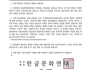 한글문화연대1472 한글 아리아리 768 한글문화연대 소식지 768 2020년 4월 23일 발행인 : 이건범 (한글문화연대 상임대표)한글문화연대 바로가기◆ [우리말 이야기] 마루 이야기 - 성기지 운영위원마루는 ‘고갯마루’, ‘산마루’처럼 가장 높은 부분을 말하기도 하고 가장 중심이 되는 곳을 가리키기도 하는 우리말이다. 그래서 멀리 수평선 한가운데 두두룩하게 솟아 보이는 부분을 ‘물마루’라 하고, 길바닥에서 가장 높이 솟은 부분을 ‘길마루’라고 한다. 마루는 자연이나 지형뿐만 아니라, 사람 몸의 ‘콧마루’나 한옥 지붕의 한가운데 가장 높은 부분인 ‘용마루’처럼 생활문화에서도 쓰이며, 글을 쓸 때 본문이 되는 부분을 ‘글마루’라 하듯 추상적 경계까지 넘나든다. 한자 ‘宗’의 훈이 ‘마루’이듯, 마루는 어떤 사물의 근본을 뜻하거나 가장 먼저 내세.. 2020. 4. 24. [공문] '온라인 그루밍'이라는 말을 쓰지 말아 주십시오. 받는 이 국무조정실 교육문화여성정책관실함께 받는 이 제목 '온라인 그루밍'이라는 말을 쓰지 말아 주십시오. 1. 국무조정실의 우리말글 사랑을 바랍니다. 2. 사단법인 한글문화연대(대표 이건범)는 한글날을 공휴일로 만드는 데 가장 앞장선 시민단체로서 ‘언어는 인권이다’라는 믿음으로 국민의 알 권리를 지키고자 공공기관의 쉽고 바른 공공언어 사용을 요구하고 있습니다. 3. 국무조정실에서는 4월 23일(목) 오전, 국정현안점검조정회의에서 디지털 성범죄 근절대책에 대해 논의하고 ‘온라인 그루밍’에 대한 처벌을 신설하겠다고 밝혔습니다. 그런데 ‘온라인 그루밍’이라는 표현은 일반 국민이 알아듣기 어려운 말이라 범죄의 실상을 제대로 알려주지 못합니다. 따라서 이런 범죄에 제대로 대응하는 데에도 방해가 될 것입니다. 이.. 2020. 4. 23. 외국어 신조어 대신 쓸 새말 4 문화체육관광부와 국립국어원, 한글문화연대가 함께 을 벌이고 있습니다. 운동 중 하나의 활동으로 문화체육관광부와 국립국어원이 '새말모임'을 꾸려 외국어 신조어를 쉬운 우리말로 바꾸고 있습니다. 2019년 10월부터 만든 새말 가운데 10개를 소개합니다. 대상어(원어)다듬은 말의미신파일러(thin filer)금융 이력 부족자서류가 얇은 사람이란 뜻으로 신용을 평가할 수 없을 만큼 금융 거래 정보가 거의 없는 사람.슬로푸드(slow food)정성 음식천천히 시간을 들여서 만들고 먹는 음식을 ‘패스트푸드’에 상대하여 이르는 말.스피어 피싱(spear phishing)표적 온라인 사기불특정 다수의 개인정보를 빼내는 전자금융사기(피싱)와 달리 특정 기업 혹은 중요 시스템 관리자나 정보 책임자 등의 특정인의 정보를 .. 2020. 4. 22. 등고선 등고선(42 X 29.5cm)은 2017년 1월에 제작하여 2018년에 전시, 발표한 작품입니다. 등고선은 평균해수면을 기준으로 글자 그대로 높이가 같은 지점을 연결한 선으로 각 지점의 높이와 지형의 기복을 나타내는 곡선입니다. 등고선의 특징은 반드시 폐곡선의 형태로 나타난다는 점에 착안하여 폐곡선으로 된 그림글자를 만들어 보았습니다. 땅의 높낮이를 색깔로 나타낼 때 높이가 낮으면 초록색 계열로, 높아질수록 노란색, 갈색, 고동색 등으로 구분하여 표현하기 때문에 채색은 이 방식을 따랐습니다. 선의 간격은 축척 1:50,000지도에서는 20m의 고도차를 나타냄으로 이것에 맞춰 고도를 표시하였습니다. 2020. 4. 21. 한글 아리아리 767 한글문화연대 소식지 767 2020년 4월 16일 발행인 : 이건범 (한글문화연대 상임대표) 한글문화연대 바로가기 ◆ [우리말 이야기] 영어투 말들 - 성기지 운영위원 제21대 국회의원 선거가 끝났다. 앞으로 4년 동안 국민의 행복한 삶을 위해 헌신해 주기를 바랄 뿐이다. 선거운동 기간 내내 국회의원 후보자들에게 ‘무엇 무엇이 요구된다’고 말해 왔는데, 이 말은 영어를 직역한 번역투 표현이다. 어느덧 우리 일상을 지배하고 있는 영어투 표현에 순응(?)하여 인터넷 에는 ‘요구되다’를 올림말로 수록해 놓았다. 하지만 본디 우리말에서 ‘요구’는 접미사 ‘하다’가 붙어 ‘요구하다’, ‘요구한다’처럼 쓰이는 말이다. 정치인들에게는 무엇 무엇이 ‘요구되는’ 게 아니라 ‘필요한’ 것이다. 그래서 “지금 요구되는 것은.. 2020. 4. 17. [한글 상식] 이에요 이예요 2020년 4월 11일 정재환의 한글 상식 ▶ 이에요 이예요 2020. 4. 16. 영어투 말들 [아, 그 말이 그렇구나-331] 성기지 운영위원 제21대 국회의원 선거가 끝났다. 앞으로 4년 동안 국민의 행복한 삶을 위해 헌신해 주기를 바랄 뿐이다. 선거운동 기간 내내 국회의원 후보자들에게 ‘무엇 무엇이 요구된다’고 말해 왔는데, 이 말은 영어를 직역한 번역투 표현이다. 어느덧 우리 일상을 지배하고 있는 영어투 표현에 순응(?)하여 인터넷 에는 ‘요구되다’를 올림말로 수록해 놓았다. 하지만 본디 우리말에서 ‘요구’는 접미사 ‘하다’가 붙어 ‘요구하다’, ‘요구한다’처럼 쓰이는 말이다. 정치인들에게는 무엇 무엇이 ‘요구되는’ 게 아니라 ‘필요한’ 것이다. 그래서 “지금 요구되는 것은 국회의원들의 양심입니다.”라는 문장은, “지금 필요한 것은 국회의원들의 양심입니다.”처럼 다듬어야 한다. 이