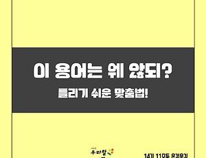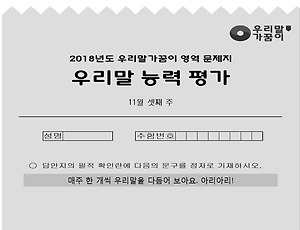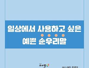 11모둠9 [17기] 모둠 활동 소식/11모둠 우리말가꿈이가 어떤 활동을 하는지 궁금하신가요?이 영상 하나로 우리말가꿈이 궁금증 해결.앞으로도 우리말을 지키고 가꾸기 위해 노력하는 우리말가꿈이가 되겠습니다.많은 응원 부탁드립니다.. 구성/연출: 하나하나 (11모둠) - 최재윤, 이주혜, 조수민, 윤진영출연: 신수호, 이노운, 차솔비, 윤진영, 이주혜편집: 이주혜제작: 우리말가꿈이 2019. 10. 28. [15기] 모둠활동 소식/11모둠 여러분을 위해 다시 돌아왔습니다. 우리말 능력 평가! 지난 우리말 능력 평가는 재치 넘치는 십자말풀이를 활용한 문제였죠. 이번엔 물 흐르듯 자연스레 읽을 수 있는 하지만 앗! 하고 무언가가 눈에 걸릴 수도 있는 일상 대화에서 외래어 찾기 문제입니다. 주어진 대화를 읽고 다듬어지지 않은 외래어가 몇 개인지 확인해보세요. 막 하나하나 눈에 밟히지 않나요. 무의식적으로 사용하던 외래어, 모르고 있었던 다듬은 말을 알아보고, 스스로 점검할 수 있는 기회가 되셨나요. 고막이나 콘서트, 리허설 같은 말은 어떻게 다듬어 써야 할지 생각도 안 하고 그대로 사용하고 있었던 것 같아 다소 의기소침해지네요. 날씨가 추워지고 한창 정신 없을 연말, 다들 감기 조심하시고 건강히 올해도 마무리하셨으면 좋겠습니다. 가까운 시일 내.. 2018. 12. 14. [15기] 모둠활동 소식/11모둠 지난 두 번의 우리말 능력 평가는 반응이 정말 뜨거웠는데요. 열렬한 반응에 의욕이 샘솟아 한층 새롭고 재밌는 문제를 출제했다고 합니다. 다들 십자말풀이는 많이들 알고 계시죠? 몇몇 잡지의 뒷면이나 신문, 방송 중에서는 우리말 겨루기에서 흔히 볼 수 있죠. 그래서 준비했습니다. 다듬은 말(순화어) 십자말풀이 가로, 세로 열쇠에 해당하는 다듬은 말을 하나하나 채우시다 보면 저기 빨간 상자 속 단어를 확인하실 수 있을 텐데요. 상자 속 단어의 뜻은 과연 무엇일까요. 다들 연필 들어주시고 출발! 모르는 다듬은 말이 있었다면 새로이 배우고, 아는 말도 다시금 확인할 수 있는 기회가 되면 좋을 것 같습니다. 기가 막힌 가치와 복을 지닌 여러분 모두, 아리아리! 우리말가꿈이 15기 아리아리! ✏기획 및 제작 : 11.. 2018. 12. 5. [15기]모둠 활동 소식/11모둠 지난번 우리말 능력 평가는 어떠셨나요? 벼룩시장이나 수제 맥주처럼 자연스레 쓸 수 있는 단어는 우리말로 쓰는 게 더 정감도 가고 좋은 것 같아요. 이번 주에도 돌아온 우리말 능력 평가 지희와 민수의 대화 중 다듬은 말로 바꾸어 쓸 수 있는 외국어/외래어는 몇 개나 있을까요? 쓱쓱이는 해리포터의 파생작인 신비한 동물들과 그린델왈드의 범죄를 개봉 당일에 보려고 해요. 나중에 다시 보기로 볼까 생각했지만, 역시 극장에서 보는 영화의 음향과 영상미는 따라갈 수 없으니까요. 간식은 친구와 각자내기를 할 예정이랍니다. 그럼 이번 우리말 능력 평가 문제도 즐겁게 풀어보시고, 다듬은 말도 보람차게 배워보시는 기회를 가지시면 좋을 것 같습니다. 기가 막힌 가치와 복을 지닌 여러분 모두, 아리아리! 우리말가꿈이 15기 아.. 2018. 11. 15. [15기]모둠 활동 소식/11모둠 다가오는 2018 수학능력평가를 맞이하기 전에, 다 같이 우리말 능력 평가를 해보는 것은 어떨까요. 문제! 지희는 대체 왜 민수에게 대답하지 않았을까요? 바로바로...무분별한 외국어, 외래어 사용 때문입니다. 친구들과 대화할 때 나도 모르게 외국어, 외래어를 많이 사용하게 되지 않나요? 이 말을 우리말로 어떻게 써야할지 막막해서 아쉽지만 그대로 사용했던 말들, 우리말가꿈이가 우리말로 어떻게 쓸 수 있을지 친절하게 알려드리겠습니다. 모두들 100점 맞으시길 바라며 기가 막힌 가치와 복을 지닌 여러분 모두, 아리아리! 우리말가꿈이 15기 아리아리! ✏기획 및 제작 : 11모둠 기가지니 2018. 11. 8. [14기]모둠 활동 소식/11모둠 "자몽하다"? "망고하다"? 이런 말들이 있었어? 지금까지 몰랐던 신기한 우리말들. 이번 온김운김 카드뉴스에서는 귀여운 어감을 가진, 과일과 동음이의어인 우리말들을 알아보겠습니다. 2018. 7. 3. [14기] 모둠 활동 소식/11모둠 이 용어는 웨 않되? 자주 쓰는 말이라도 막상 쓰려면 맞춤법이 이게 맞나 헷갈릴때가 있는데요. 이번 온김운김 카드뉴스에서는 일상생활에서 많이 사용하지만 항상 헷갈리는 맞춤법을 알려드리려고 합니다. 지금 바로 온김운김 카드뉴스를 통해 확인한 후 같이 잘 지켜보아요. 2018. 6. 15. [14기] 모둠 활동 소식/11모둠 다가오는 6월13일!! 제7회 전국동시지방선거가 있습니다. 법정공휴일에 휴가를 즐기기 전, 투표는 필수인 거 아시죠~? 일상생활에서는 잘 사용하지 않는 선거 관련 용어들을 온김운김과 함께 알아봐요! 2018. 6. 7. [14기] 모둠 활동 소식/11모둠 순우리말을 사용해 이름을 짓는 등 요즘 순우리말에 대해 많은 분들이 높은 관심을 가지고 있는데요, 오늘 가져온 소식은 "일상에서 사용하고 싶은 예쁜 순우리말" 입니다 2018. 5. 24. 이전 1 다음