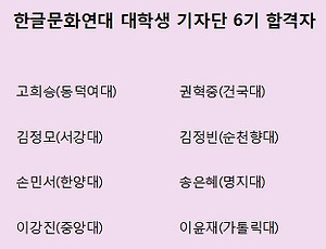 6기15 [누리방송 5-136] 대학생들의 아기자기 2 [우리말 아리아리 다섯째 타래 136회] ▶ 대학생들의 아기자기 2 - 우리가 알바야 2편 한글문화연대 대학생 기자단 6기로 활동 중인 기자단에서 '대학생들의 아기자기'로 목요일마다 다양한 소식으로 찾아옵니다. 앞으로 많이 들어주세요. ▷ 출연: 고희승, 권혁중, 김정빈, 서정화, 신예지, 이강진, 이윤재 (한글문화연대 대학생 기자단 6기) ▷ 제작: 한글문화연대 국어문화원 ▷ 누리집: www.urimal.org 매주 화요일, 목요일에 찾아 뵙겠습니다. 화요일: 배우리의 목요일: 대학생 기자단 6기 "우리말 아리아리" 팟빵에서 듣는 방법 1. 팟빵(podbbang.com) 에 접속하여 '우리말 아리아리' 로 검색한다. 2. '우리말 아리아리', '그러니까 말이야' 채널에서 각 회차를 선택하면 들을 수 있.. 2019. 8. 22. [사진] 대학생 기자단 5기 마침 마당, 6기 오름 마당 * 때: 2019년 4월 6일(토) 낮 12시 * 곳: 한글문화연대 활짝 5기 하성민 기자 마침 보람 5기 이아령 기자 마침 보람 5기 변용균 기자 마침 보람 5기 박찬미 기자 마침 보람 5기 박다영 기자 마침 보람 5기 김온 기자 마침 보람 5기 강아현 기자 마침 보람 5기 조혜겸 기자 마침 보람 5기 변용균 기자 우수기자상 -으뜸- 5기 박찬미 기자 우수기자상 -버금- 5기 박다영 기자 우수기자상 -버금- 2019. 4. 8. 대학생 기자단 5기 마침 마당 및 6기 오름 마당/2019.04.06(토) 2019년 4월 6일(토)에는 한글문화연대 대학생 기자단 5기와 6기가 한자리에 모이는 날이었습니다. 먼저 6기의 3일 차 교육이 오전 10시부터 12시까지 있었습니다. 그리고 12시부터는 5기의 마침 마당과 6기 오름 마당이 차례로 열렸습니다. 6기의 3일차 교육 첫 시간으로는 올바른 우리말 발음과 인터뷰라는 주제로 이정민 가톨릭평화방송 아나운서에 강의가 있었고, 두번째 시간으로는 기자로 산다는 것이라는 주제로 최미랑 경향신문 기자님의 강의를 들었습니다. 5기 마침 마당에서는 대학생 기자단 5기로 열심히 활동했던 9명의 학생이 마침 보람(수료증)을 받았습니다. 강아현(동국대/미디어커뮤니케이션학과) 김온(성균관대/연기예술학과) 박다영(이화여대/커뮤니케이션미디어학부) 박찬미(세종대/법학부) 변용균(숭실대/.. 2019. 4. 8. 대학생 기자단 6기 교육/2019.03.30(토)~31(일) 2019년 4월부터 새로 활동을 시작하는 대학생 기자단 6기가 구성되었습니다. 기자단은 활동 전에 교육을 먼저 받는데 모두 3일 동안 진행됩니다. 먼저 지난 토요일, 일요일(2019년 3월 30일~31일)에 공간 '활짝'에서 대학생 기자단 6기의 1,2일차 교육을 했습니다. 1일차 첫날. 첫 시간은 한겨레신문 강재훈 기자가 라는 주제로 보도 사진을 찍는 방법, 자세 등을 강의했는데 실생활에서도 활용하기 좋아 학생들에게 매우 유익한 시간이었습니다. 점심 시간 이후 약 한 시간 정도 기자단이 서로 알아갈 수 있게 한 명씩 자기소개와 장기 자랑을 했습니다. 앞으로 1년 동안 함께할 친구들 앞에서 기자단을 지원한 이유와 평소 자신이 좋아하는 것 등 일상적인 이야기뿐만 아니라 앞날의 고민도 이야기하며 공감도 하는.. 2019. 4. 4. [알림] 한글문화연대 대학생 기자단 6기 교육 일정 1. 정기 교육: * 기간: 3월 30일~31일, 4월 6일 * 모꼬지: 5월 11일~12일로 변경되었습니다. (1) 국어 및 글쓰기 교육 국어 운동의 역사와 철학(이건범) /꼭 알아야 할 어문규범(성기지) /문장 다듬기와 우리말 상식(김명진) /주제 토론 * 훈민정음 창제 원리와 한글의 우수성(김슬옹)-5월에 수시 교육으로 예정 (2) 취재와 기사 교육 보도 사진의 이론과 실제(강재훈 기자, 한겨레신문) /기사 작성법(이재훈 기자, 한겨레신문) /기자로 산다는 것(최미랑 기자, 경향신문) /기자의 질문, 기자의 눈(노동규 기자, 에스비에스방송) /올바른 우리말 발음과 인터뷰(이정민 아나운서, 가톨릭평화방송) 2019. 3. 18. [알림] 한글문화연대 대학생 기자단 6기 합격자 * 축하합니다 ** 한글문화연대 사무국입니다. 지난 3월 9일(토)~11일(월) 까지 3일에 걸쳐 1차 서류심사를 통과한 지원자 대상으로 면접을 진행하여 최종 16명의 학생을 6기 기자단으로 정하였습니다. 한글문화연대 대학생기자단 6기로 뽑히신 분들은 아래와 같습니다. 더불어 대학생 기자단 지원으로 우리말과 한글 그리고 한글문화연대에 관심과 열정을 보여주신 분들 모두 고맙습니다. 6기의 첫 모임과 교육 일정 안내는 합격하신 분들께 개별로 알려드립니다. 앞으로 1년간 6기 기자단 여러분의 성실하고 활발한 활동을 기대합니다. 2019. 3. 14. [알림] 한글문화연대 대학생 기자단 6기 모집합니다. 대학생기자단 6기 모집(~3월 3일) 1. 지원 자격 ▶우리말과 한글, 언어문화를 둘러싼 여러 가지 주제를 기사로 다루고자 하는 대학생 또는 대학원생(휴학생 포함) ▶ 교육, 기획 모임(월 1회)에 참석할 수 있는 사람 ▶ 달마다 기사 1건 이상 쓸 수 있는 사람 ▶ 영상 분야 - 영상 기획/촬영/편집 등을 할 수 있고 캠코더와 영상편집 프로그램을 다룰 줄 아는 사람 ▶ 글/사진 분야 - 일반 취재나 인터뷰를 하여 기사를 쓸 수 있고 기사에 넣을 사진을 찍는데 어려움이 없는 사람 2. 모집 인원: 15명 3. 모집 분야: 글/사진, 영상 4. 활동 기간: 2019년 3월~2020년